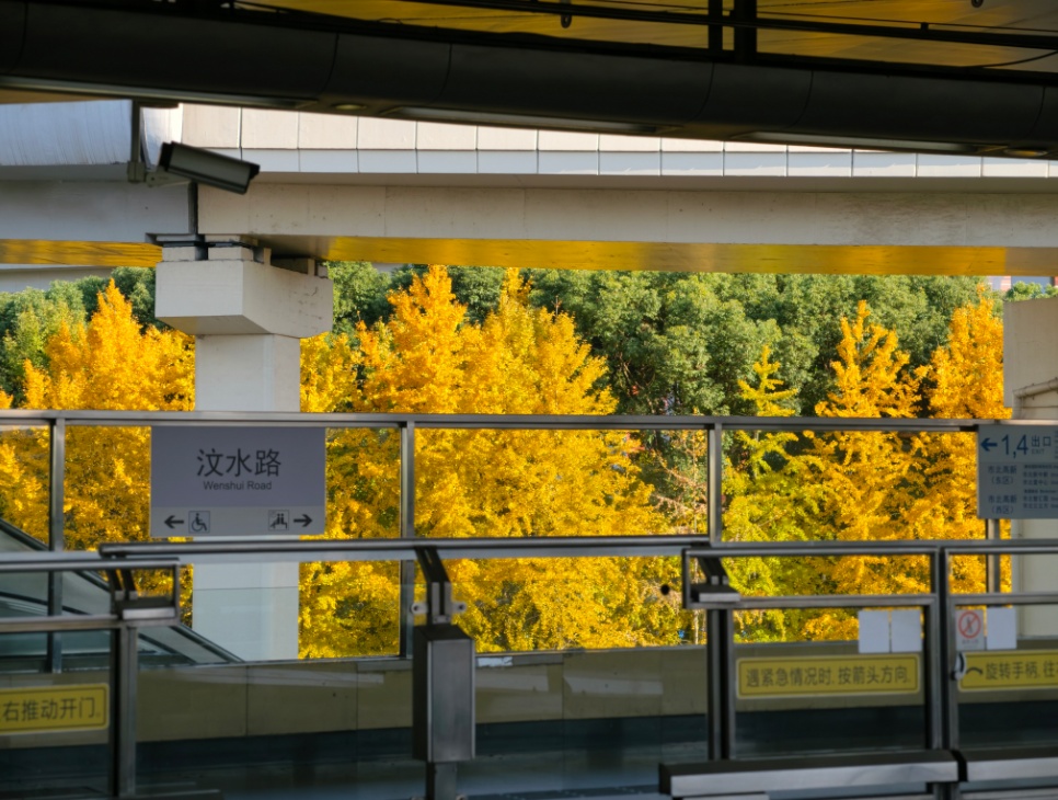 近日,记者实地探访汶水路站,列车还未进站,视线即刻被大片明艳的银杏吸引。阳光透过簇簇金叶洒落,站台、天桥、步道仿佛都浸润在柔和的光晕中。