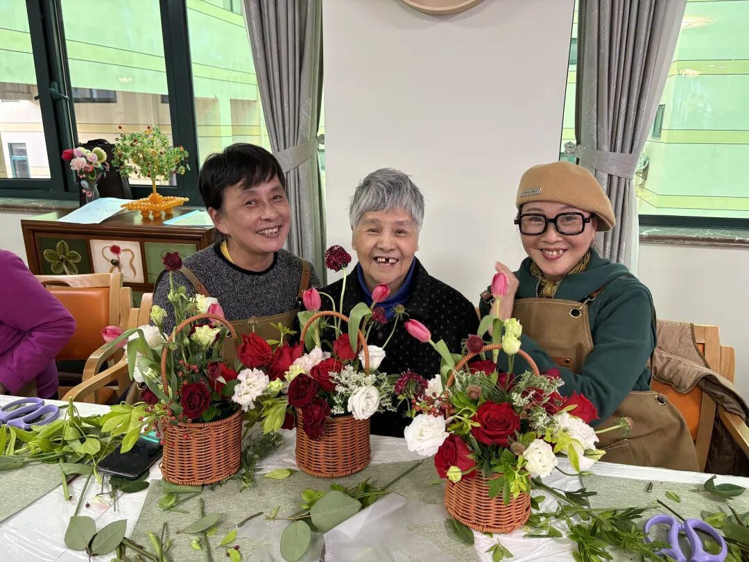 花香弥漫的活动室里,七八十岁的“老学生”们专注地修剪花枝,身旁的子女们化身得力助手,或帮忙配色,或用手机记录父母创作的瞬间。这是福利院的插花活动现场,在专业花艺师的指导下,老人们精心挑选花材,巧妙构思布局,将普通的花枝变成一件件独具匠心的艺术品。而最打动人心的,是子女们陪伴父母参与的温馨画面:许多“大孩子”暂时放下繁忙的工作,专心做父母的“插花助理”。对于行动不便未能到场的长者,活动组织方也特别准备了“移动的绿意”。一盆盆生机勃勃的绿色盆栽被送到老人房间。