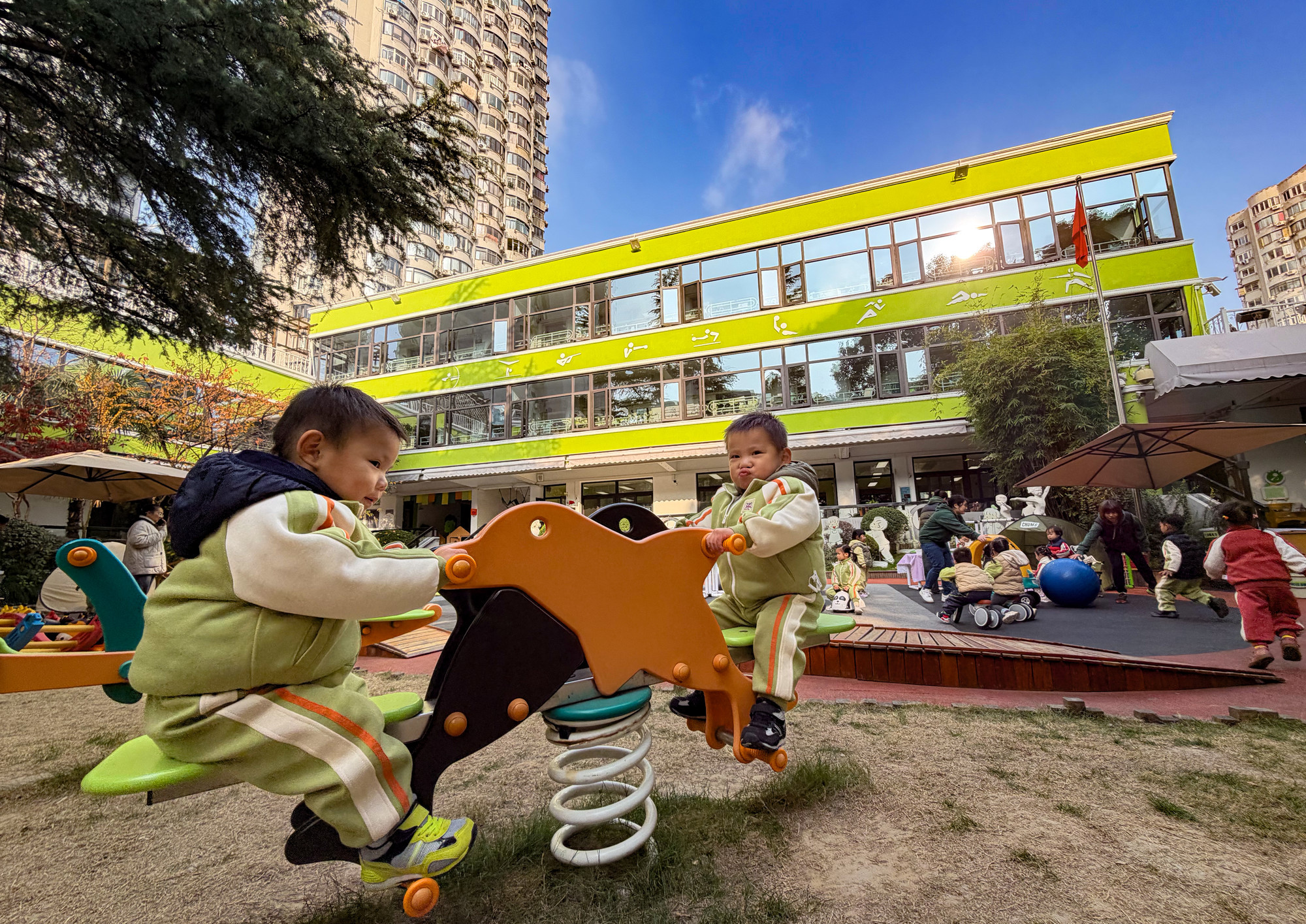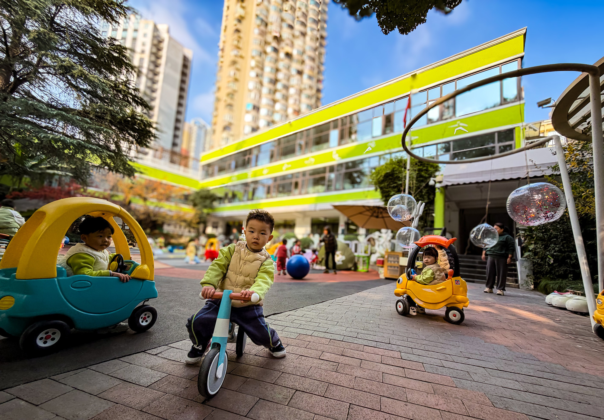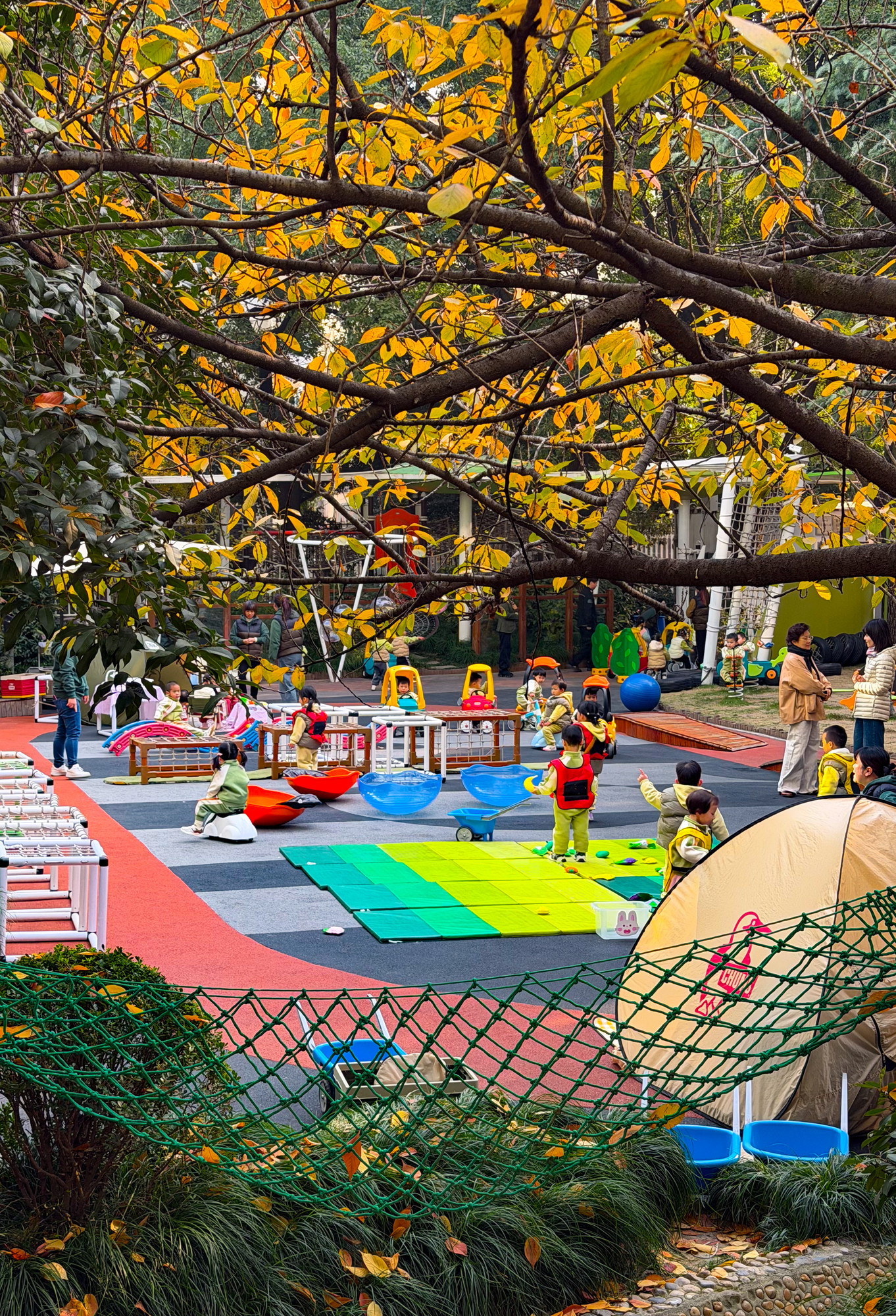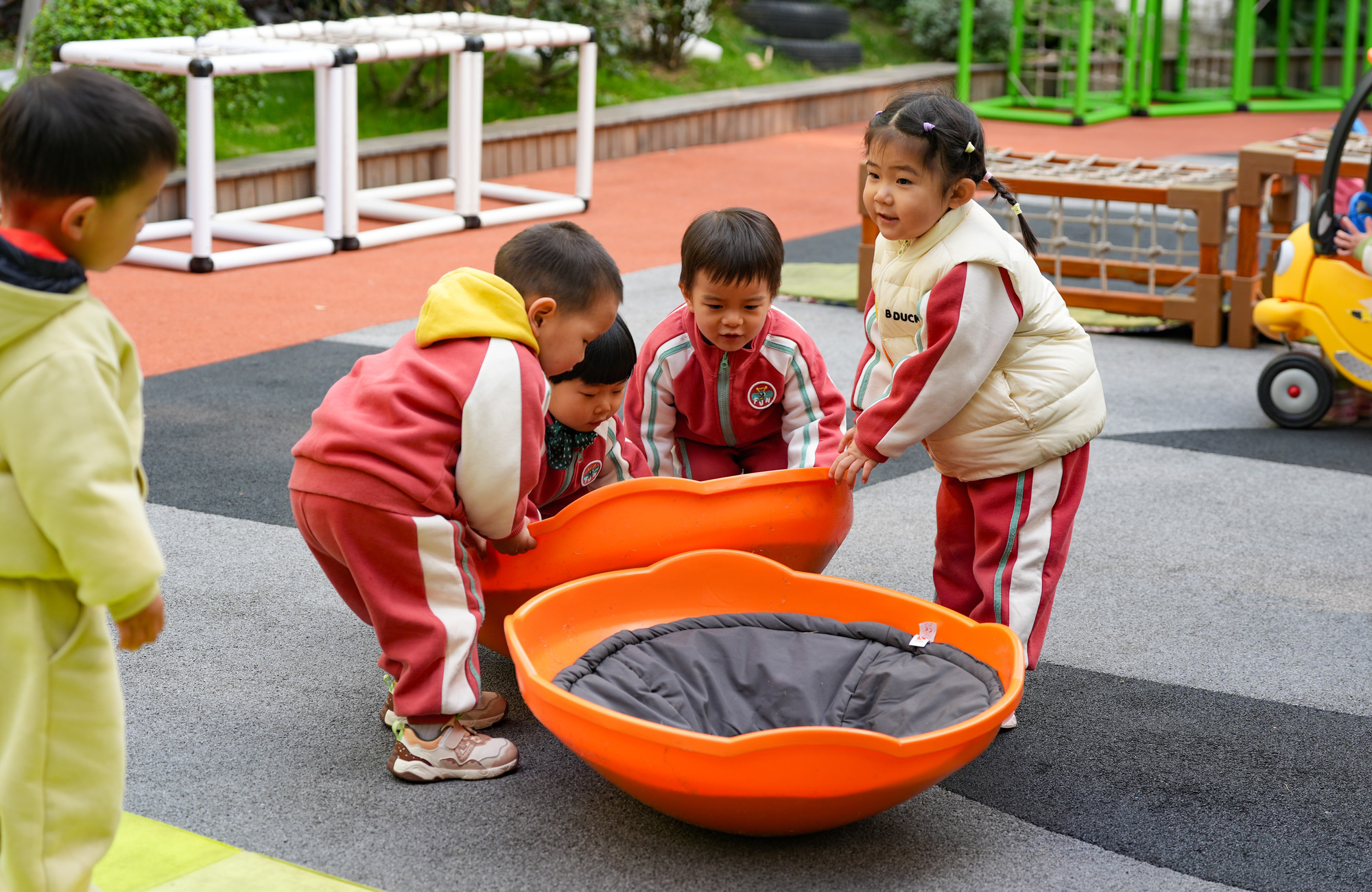 教室里,整齐摆放着迷你桌椅和各种玩具材料,桌椅边缘设计成圆角,在与环境的互动中,孩子有满满的安全感;走出教室,长廊里同样很好玩,秋日暖阳映衬下,师生互动有爱又温馨;走廊里有几个“圆圈圈”,好动的小朋友钻进圈圈顺着滑滑梯往下,就能来到操场——教室、走廊、操场,这些场域既有分隔又“无边界”,宝贝们沉浸其中,感受快乐、体验自主,尽情玩耍和探索。