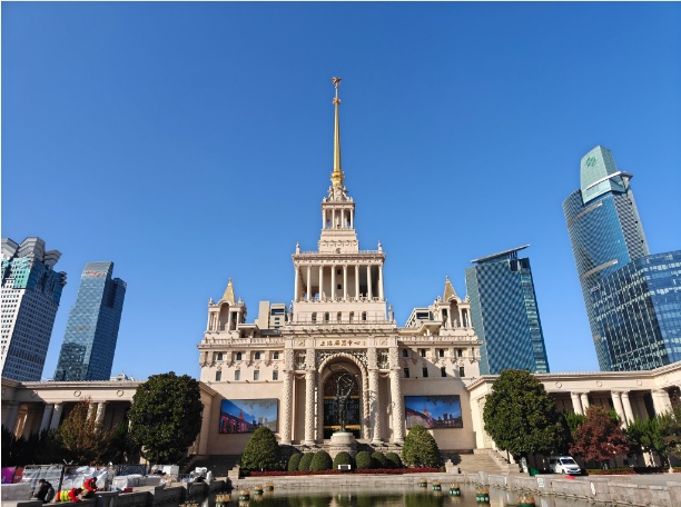 机位提示:上海展览中心前广场可用对称构图拍摄建筑全貌,金色雕塑与蓝天形成鲜明对比。