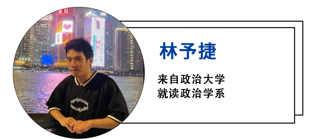 A1:我是来自台湾政治大学,政治学系的林予捷,自己的爸爸跟妈妈正好都是外省第二代,加上叔叔也在南京。这样的家庭背景就让我从小对大陆就有憧憬与向往,想看看自己家里的长辈过去生长的土地,也想亲眼看看闻名国际的亚洲金融中心,上海到底与台北有什么样的差异。