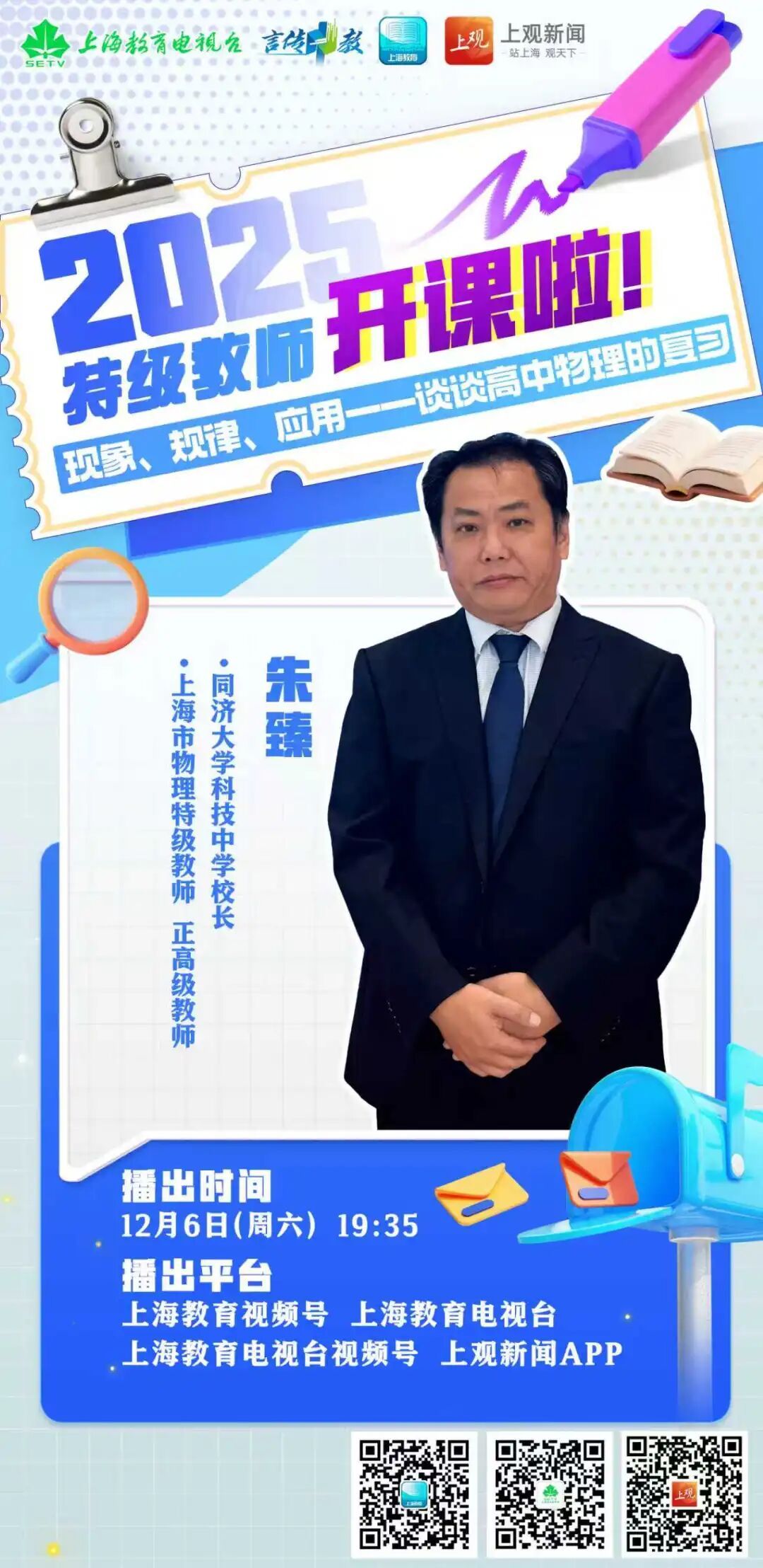 12月6日(周六)19:35,2025年“特级教师开课啦”将在上海教育视频号、上海教育电视台、上海教育电视台视频号、上观APP同步播出第八期。同济大学科技中学校长、上海市物理特级教师、正高级教师朱臻带来的讲座主题是现象、规律、应用——谈谈高中物理的复习