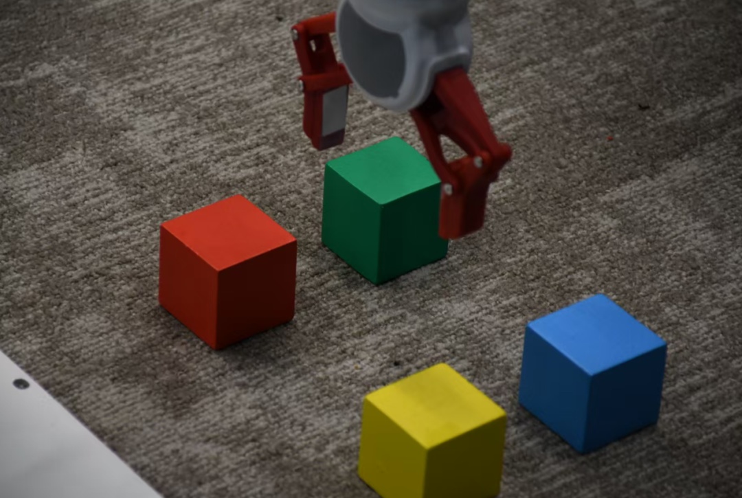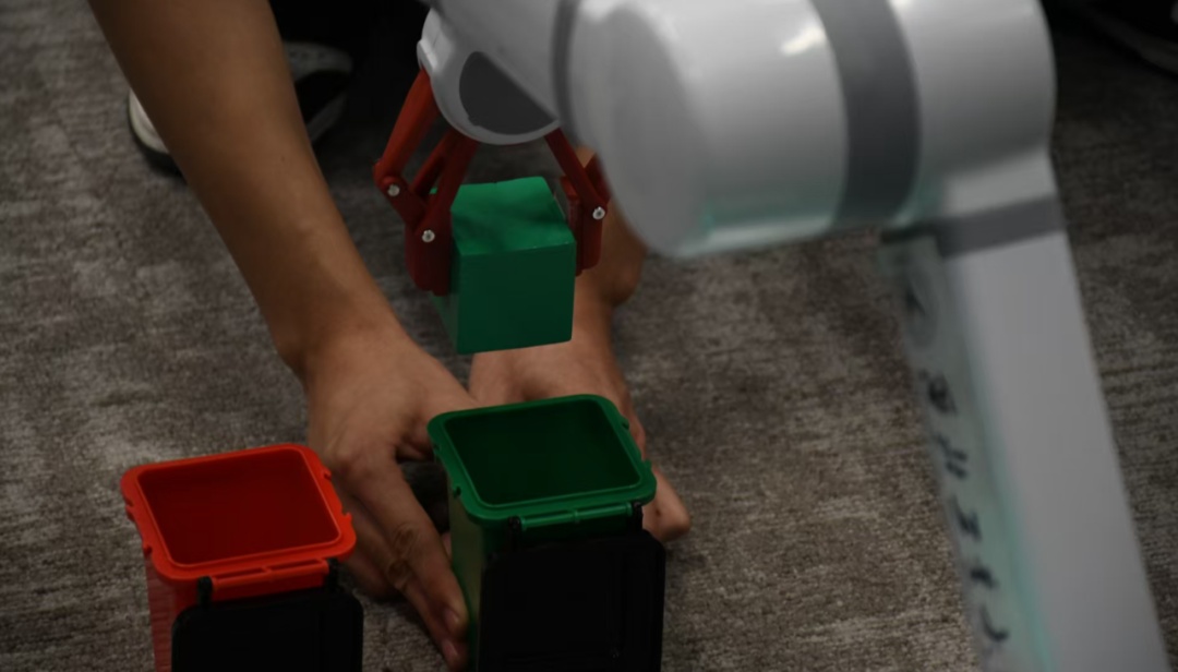 相比于脑控赛车场的速度与激情,脑控机械臂比赛则显得更加安静专注。选手们需要在最短时间内,通过脑电信号“命令”机械臂末端的夹爪将4个不同颜色的积木移动到对应的小垃圾桶内,并完成抓取、移动、放置等一系列精细动作。