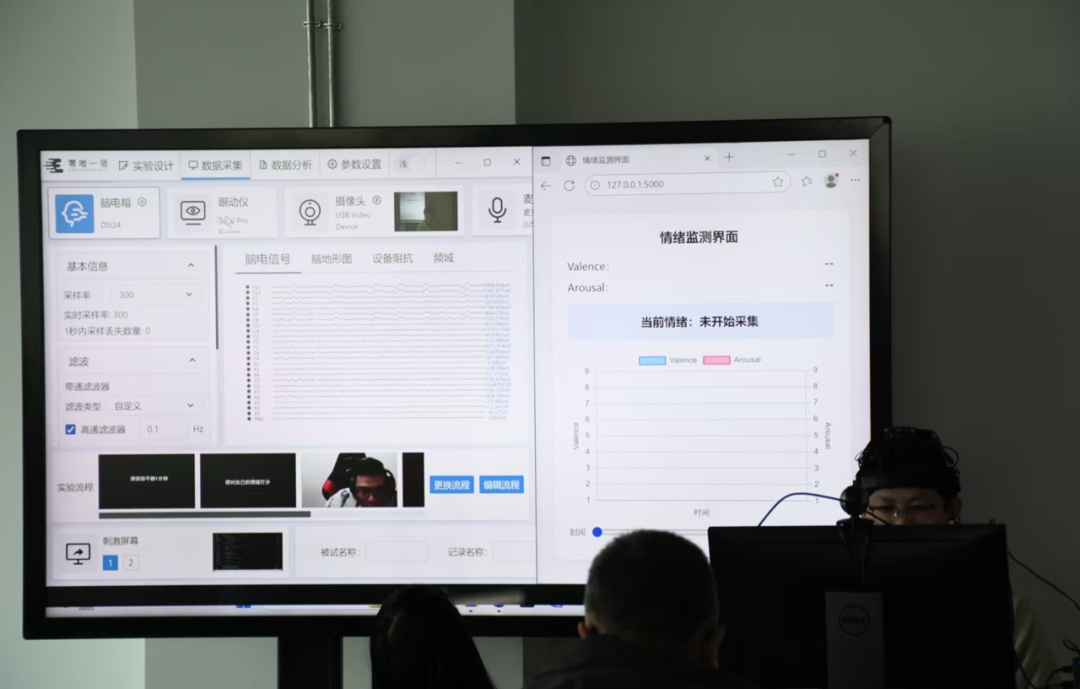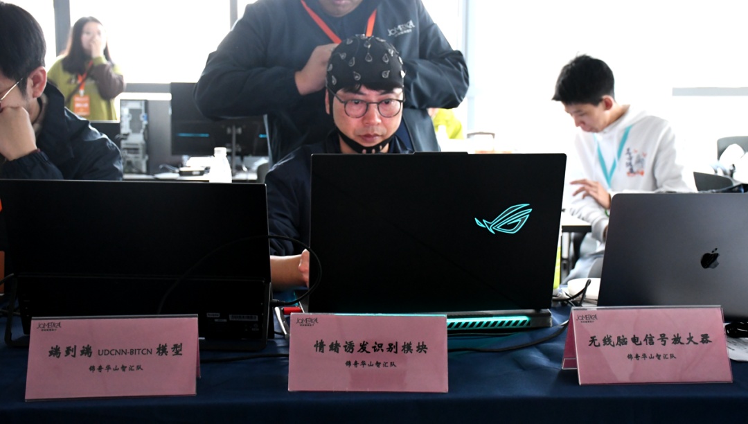 此外,在情绪感知、疲劳监测比赛中,不同队伍也带来了精彩的演示。上海交通大学BCMI实验室带来了“情绪测谎仪”般的创新应用,团队融合脑电、眼动、摄像头、麦克风等多模态数据采集,精准输出愉悦、悲伤等情绪标签并支持数据回溯;电子科技大学脑力续航队完善了算法,创新推出无人机操控模式,这将能实现对关键岗位、高危职位的工作人员进行疲劳测试……