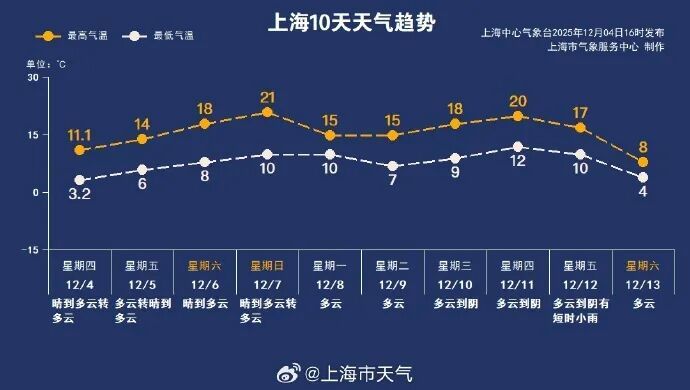 又一个温暖的双休日在等待大家。最高气温周六18℃,周日21℃,阳光充足,天气干燥,不论是洗衣晾晒还是出门走走,都挺合适。下周初,一股弱冷空气抵达申城,最高气温回落至15℃,最低气温变化不大。周中再度回暖。需关注的是下周末的冷空气,降温较为猛烈,周六全天气温又要被压制在10℃以下。近期气温起伏大,晴多雨少,天气干燥,请大家及时补水防感冒。