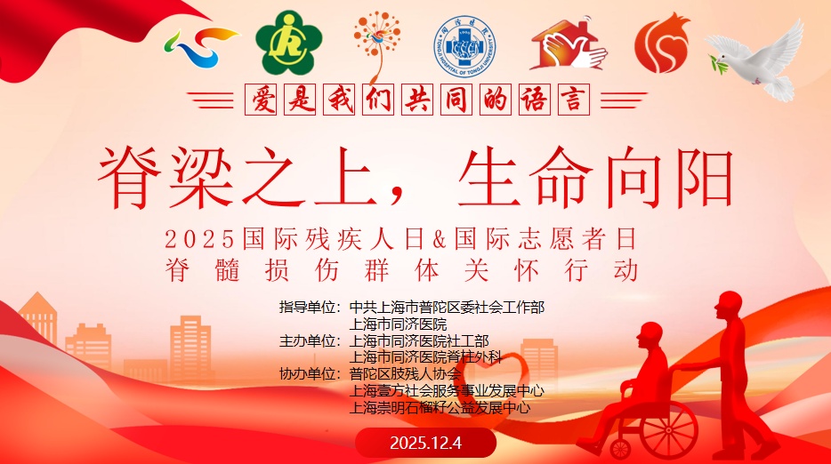 为促进公众对脊髓损伤群体的关注,传递“平等、参与、共享”的理念,搭建伤友交流互助、重拾信心的平台,并弘扬志愿服务精神,12月4日下午,时值第34个国际残疾人日与第40个国际志愿者日到来之际,在中共上海市普陀区委社会工作部、同济大学附属同济医院的指导下,由同济医院社工部、脊柱外科主办,普陀区肢残人协会、上海壹方社会服务事业发展中心、上海崇明石榴籽公益发展中心协办的“脊梁之上,生命向阳”脊髓损伤群体关怀行动,在医院同康楼东一楼大厅温暖启动。普陀区委社会工作部副部长汤郭平、同济医院党委副书记吴登龙、骨科主任程黎明,以及上海崇明石榴籽公益发展中心理事长黄亮、上海壹方“希望之家”项目负责人宋佳音等出席活动。现场还邀请了来自“希望之家”的脊髓损伤伤友、家属及社会志愿者共同参与。活动由同济医院社工部负责人王嫱主持。 吴登龙在致辞中强调,“脊梁”不仅是身体的支柱,更象征着面对困境时不屈的意志与向阳而生的勇气。医院致力于构建从医疗到社会的全周期支持体系,希望以此次活动为契机,推动社会理解、助力伤友重拾信心。 程黎明随后分享指出,脊柱外科团队与国际前沿同步,持续开展干细胞移植等前沿研究,强调康复需兼顾身心与社会功能,鼓励伤友积极重返社会。 活动中,“脊友同行”志愿服务队正式成立,汤郭平为队伍授旗,伤友代表李合山、孙劼接旗。服务队现场宣誓并发布首批志愿服务清单,涵盖同伴支持、技能共享与艺术疗愈等内容。现场同步发布《脊髓损伤患者社会康复指导手册》与《“轮椅人生”生命故事册》,前者整合政策与生活资源,后者收录真实生命故事,为伤友提供实用支持与情感陪伴。 在伤友分享环节,李合山与孙劼讲述了各自面对脊髓损伤、重启人生的经历,展现出轮椅上的精彩人生。二人受聘为“脊友同行”志愿服务队队长,分别带领“飞毛腿快线”和“行者驿站”两支分队,为更多伤友提供支持。 互动环节组织伤友进行“脊柱卫士”知识竞答、“曼陀罗・脊梁印记”绘画及“向阳寄语”明信片书写。参与者在互动中学习健康知识、表达情感感悟,所写寄语也将传递至其他伤友手中,让温暖随文字流转、力量在交流中生长。 本次活动不仅为脊髓损伤群体提供了实质性的支持与陪伴,也通过多元形式促进了社会对该群体的理解与关怀,生动诠释了“脊梁之上,生命向阳”的主题内涵。活动在温馨的合影中圆满落幕,后续将以此次活动为起点,持续推动脊髓损伤群体的社会融合与康复支持,助力每一个生命在阳光下向阳而生。