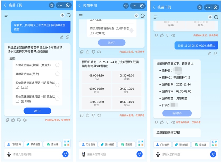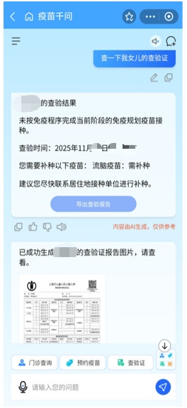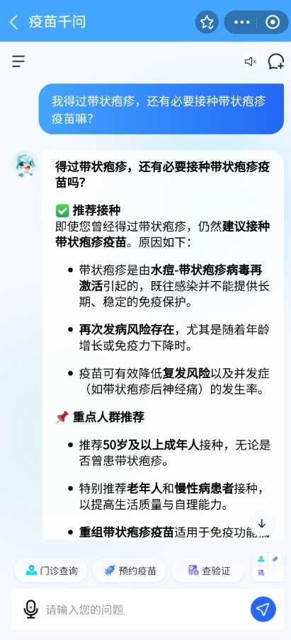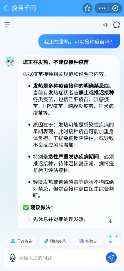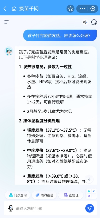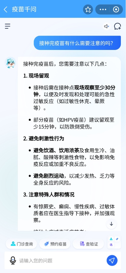 好消息!为进一步提升市民疫苗接种体验,让疫苗知识触手可及,“健康云”平台全新推出“疫苗千问”智能服务模块,在闵行区试点试用,为市民带来便捷接种服务和专业疫苗知识解答。 一站式解决疫苗疑惑 随时随地想问就问 您是否曾对疫苗接种有各种疑问?不知道哪种疫苗适合自己?不清楚接种后的注意事项?“疫苗千问”是一个集成了海量权威疫苗知识的智能互动平台,它就像一位时刻在线的“疾控专家”,为您提供全天候的疫苗知识解答服务! 无论是儿童免疫规划疫苗、成人疫苗接种问题,还是HPV疫苗、流感疫苗等特定疫苗的接种困惑,“疫苗千问”都将为您提供专业、精准且清晰易懂的解答,为您的健康保驾护航。