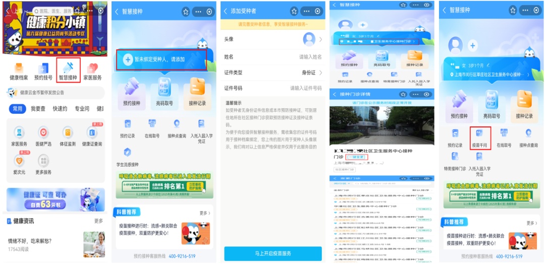 进入“智慧接种”服务专区,添加受种者绑定信息(可添加多位受种者);