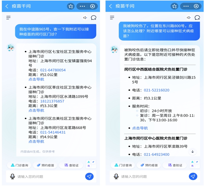 可一键轻松查询到各类疫苗接种门诊信息,包括门诊地址、电话、服务时间等(提问时应尽量表述清楚当前所在地理位置➡闵行区,所需查询门诊类型等);