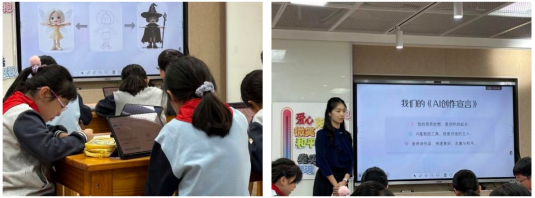 黄浦区北京东路小学教师汪进一带来的课程“AI +手办模型师”,以《山海经》中的文化IP为创作灵感,引导学生从手绘创作入手,借助AI工具体验从二维设计到三维模型生成的完整创作流程,实现了科技与人文教育的深度融合;水丰路小学分校教师胡晨晨则带领学生利用AI工具,将自己创作的故事变成视听化的影视作品,同时,让学生在创作中理解人机协同的“边界”,深入思考了科技与人文的关系。