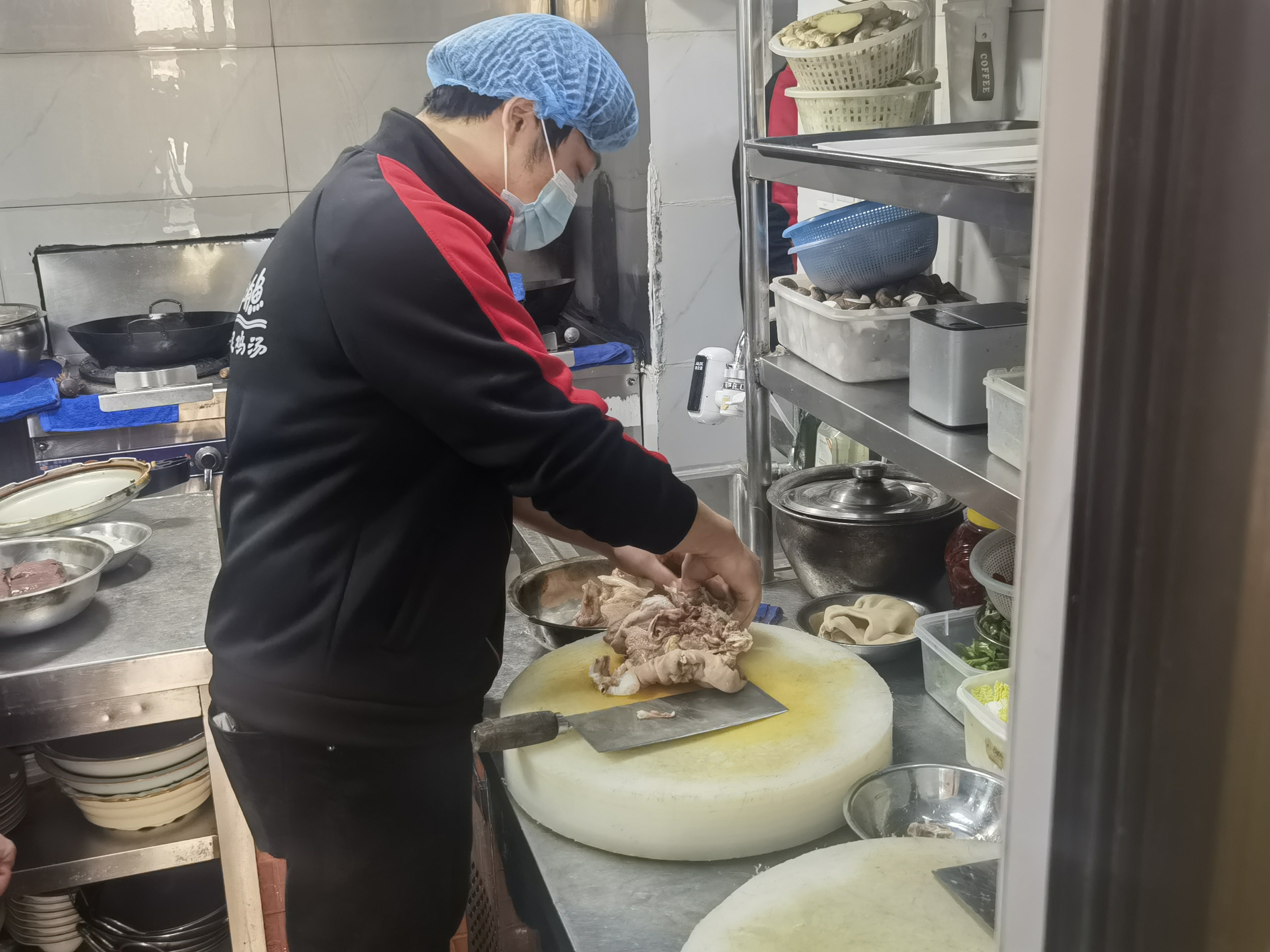 上午9时半,小昆山镇的年年有鱼饭店里,厨师正将新鲜羊头肉、羊肠、羊肚、羊血等食材依次放入高压锅,并加入清水和葱姜蒜蒸煮。半小时后,炖好的食材切片放入热锅爆炒。接着,厨师又往锅中倒入开水,放入羊血,又焖煮两分钟直至羊汤呈现乳白色,香浓味美的羊肉汤便完成了。“我们家的羊肉汤已经做了十几年了,每天食材都是现买现做,销量很好。有些顾客不方便堂食,我们也提供外带服务。”年年有鱼饭店老板刘山恒介绍。