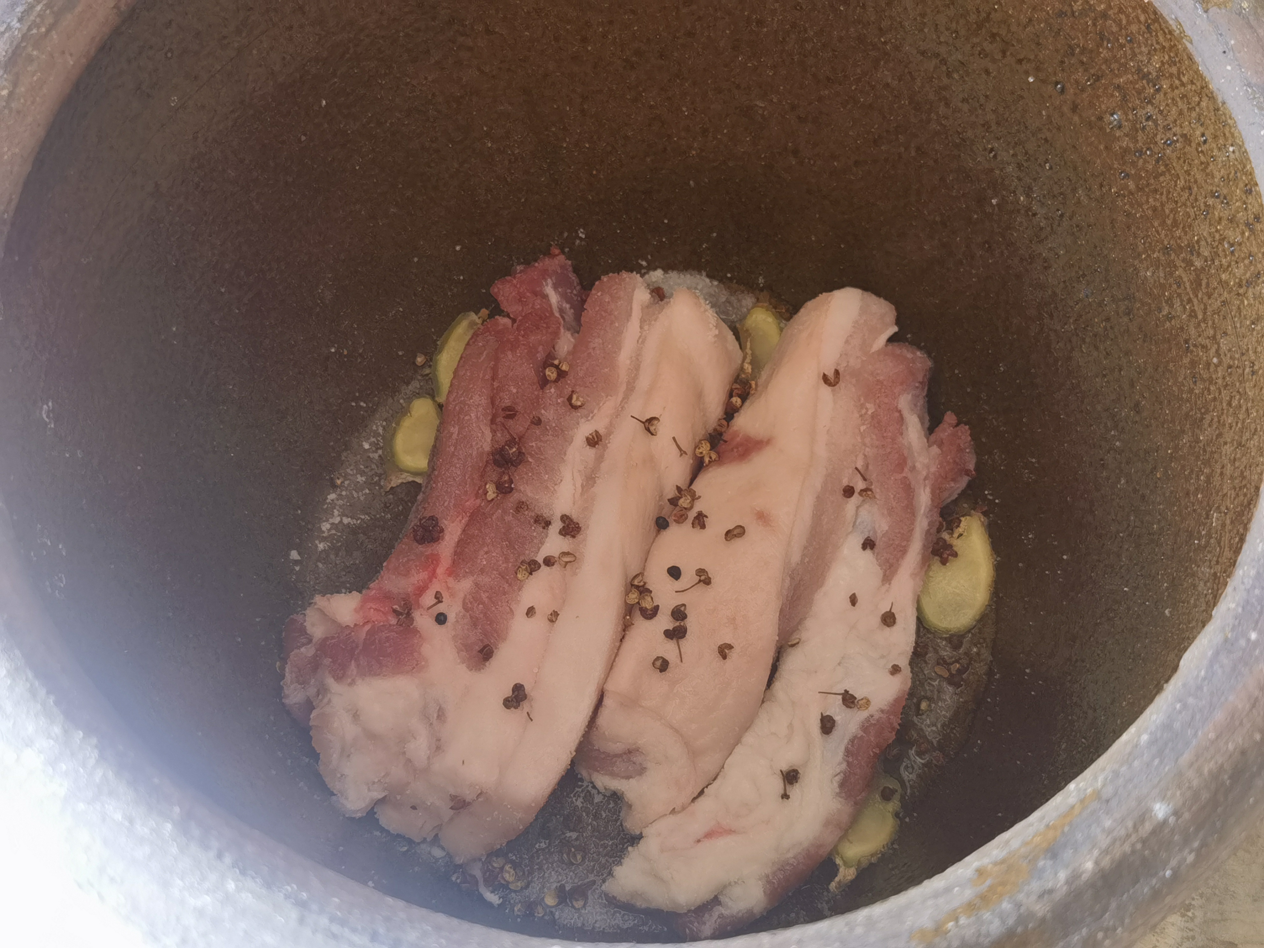 相聚的阿姨们还计划趁着天气晴好,提前腌制一些腌肉。只见阿姨将新鲜五花肉均匀涂抹上食用盐后,又往缸中放入适量的花椒、姜片,并倒入白酒,最后再用石块压紧。“腌了以后肉会出汁,汁出来后,再翻一翻放个两天,遇上天气好时拿去晒一晒,就可以吃了。”张阿姨说。