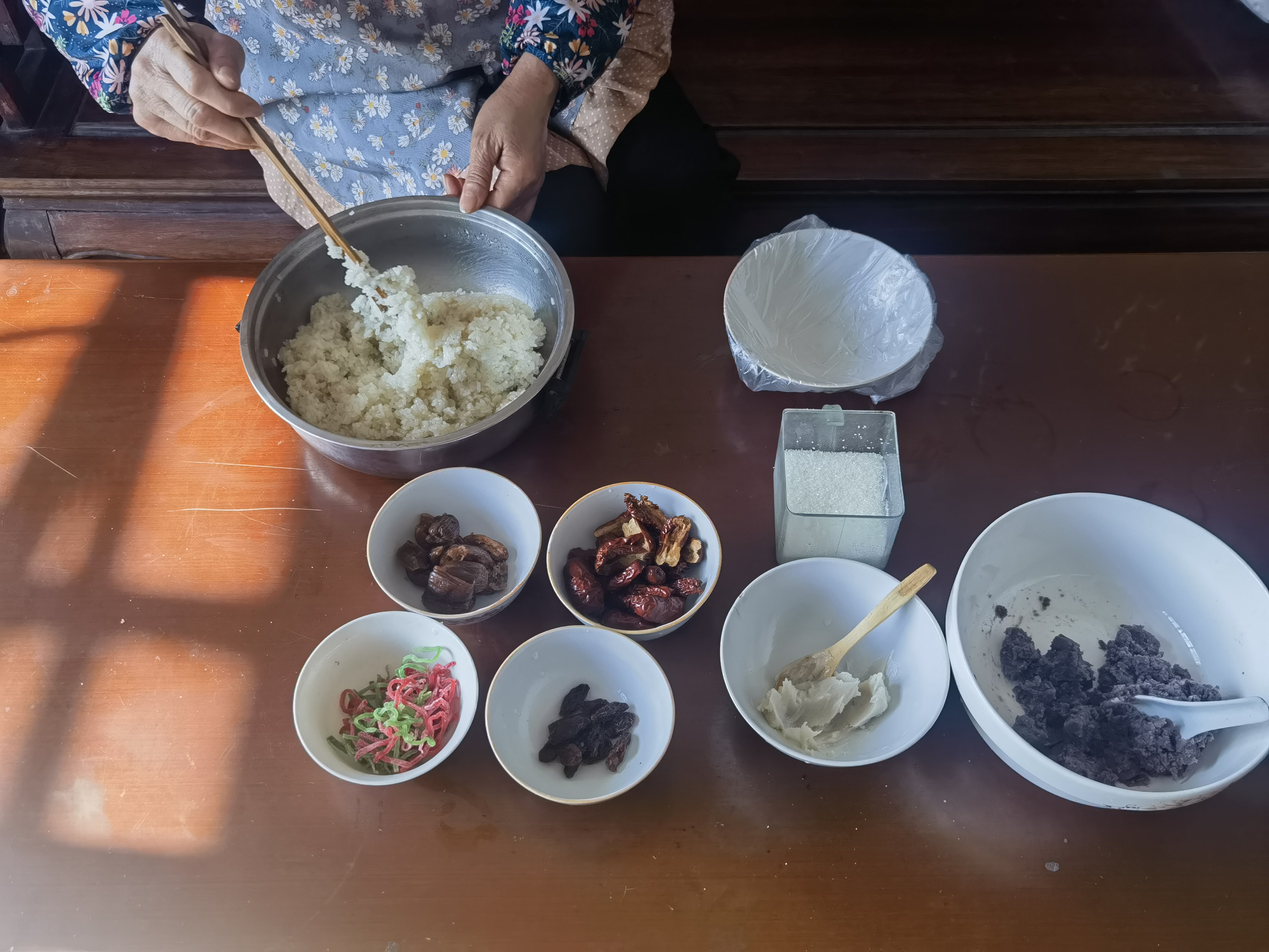 正如刘山恒所言,等待这锅羊肉汤的居民张阿姨刚好计划打包回家和朋友分享这道美味。回到家中,阿姨们还忙活着做起了八宝饭。只见她们清洗红枣、蜜枣、葡萄干并去核,再盛出煮熟的糯米饭,放入猪油、白糖充分搅拌,随后将事先准备好的配料在碗底摆好盘,倒入糯米饭压实,铺上豆沙后再覆盖一层糯米饭并倒扣在碟中,这样一来,一碗热气腾腾的八宝饭便制作好了。