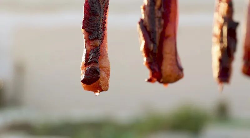 选肉块干爽紧实、肥瘦分明,肌肉呈自然红色或暗红色,脂肪乳白或微黄,避免颜色暗沉、有霉点或异常鲜红的产品。按压有弹性、不粘手。有自然咸香、腊味,无哈喇味或霉腐味。