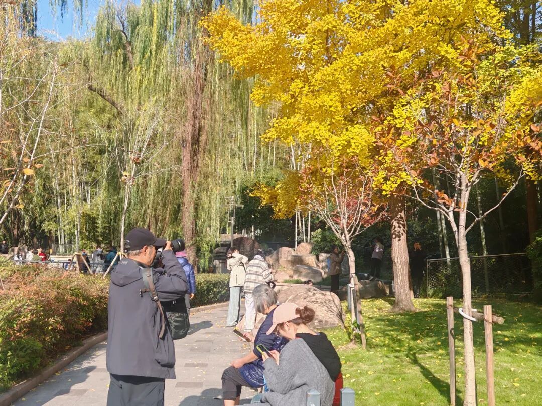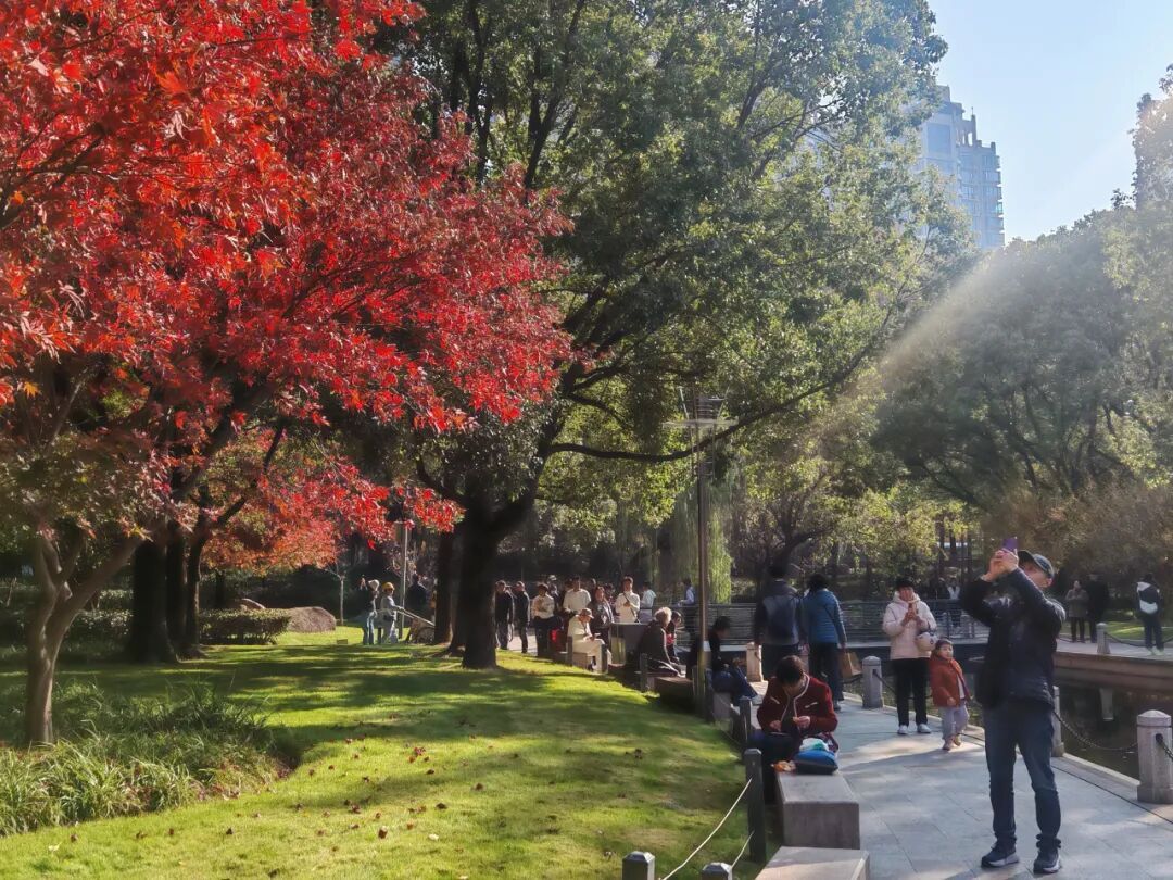 徐家汇公园里热闹非凡,随处可见拿着相机、手机的市民,他们被眼前的美景深深吸引,纷纷驻足拍摄。在火红的枫树前,一位女士引导孩子摆姿势,以色彩鲜艳的枫树为背景,用手机记录下美好的亲子时光。还有一位爷叔端着相机对着银杏树不断调整着角度和参数,试图捕捉到最完美的画面。爷叔告诉记者:“秋天的银杏与梧桐都特别出片。尤其是银杏,它的色彩在秋天中显得最亮眼、最具生命力。”