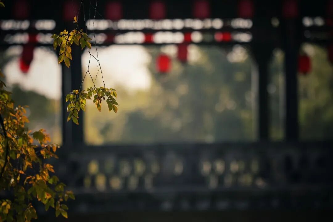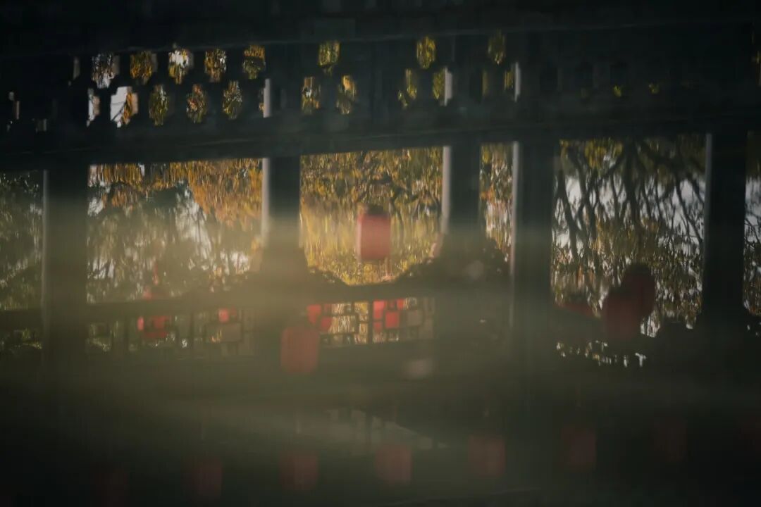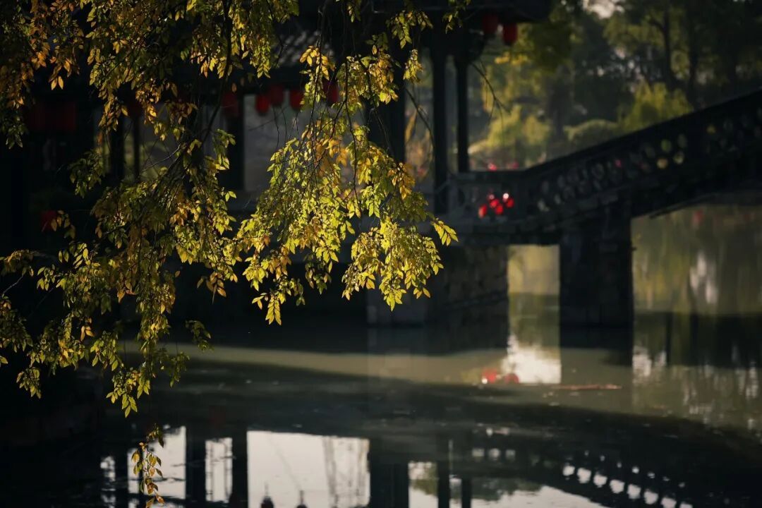 石桥、红灯、树影层层交叠出水乡的静意