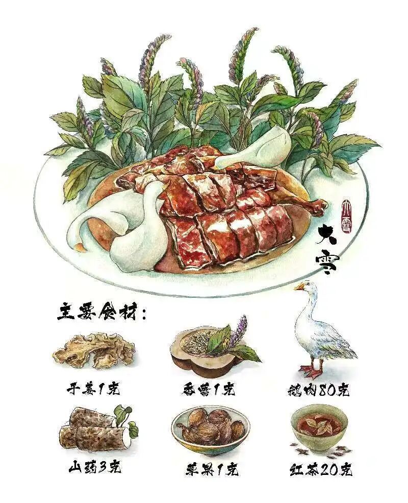 今天让我们试试这份大雪药膳美食——山药干姜烤鹅肉。