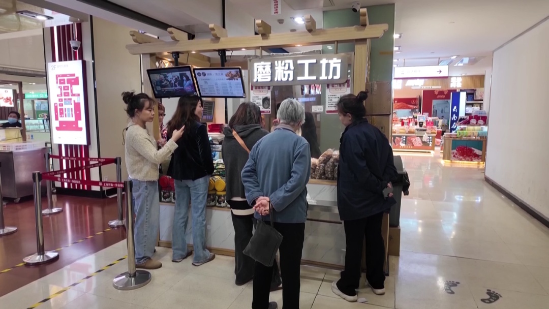 在腌腊制品柜台不远处,机器打磨的轰鸣声持续不断,原来是现磨芝麻核桃粉的柜台前热闹非凡。购买芝麻核桃粉的市民络绎不绝,打磨机器也一刻不停地运转着。
