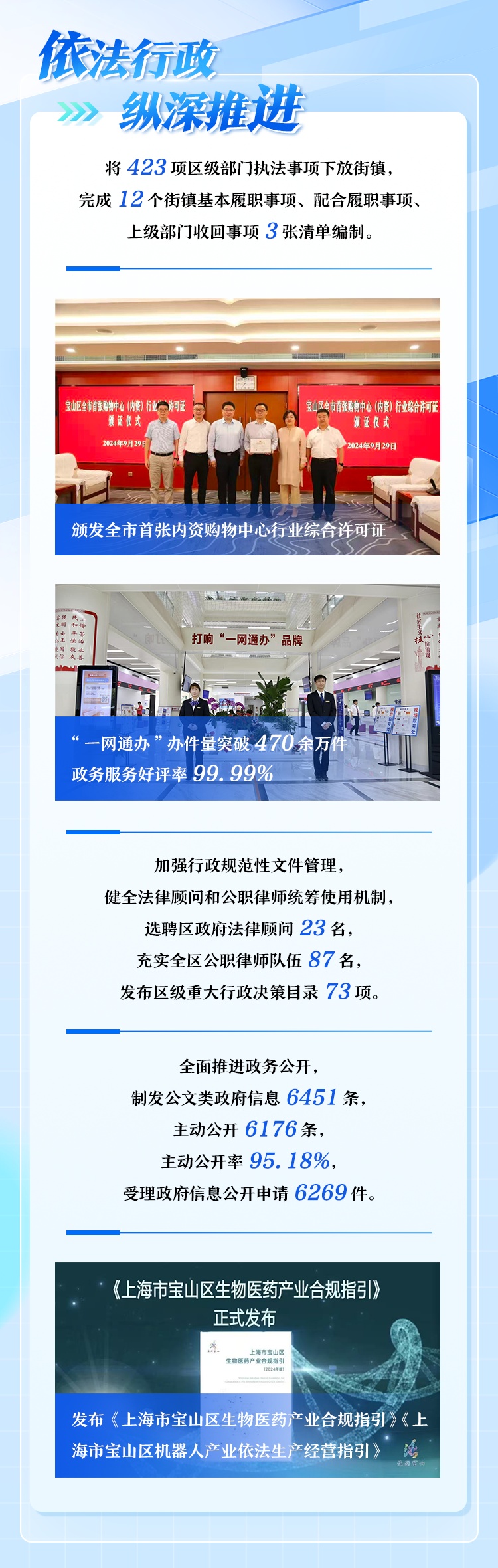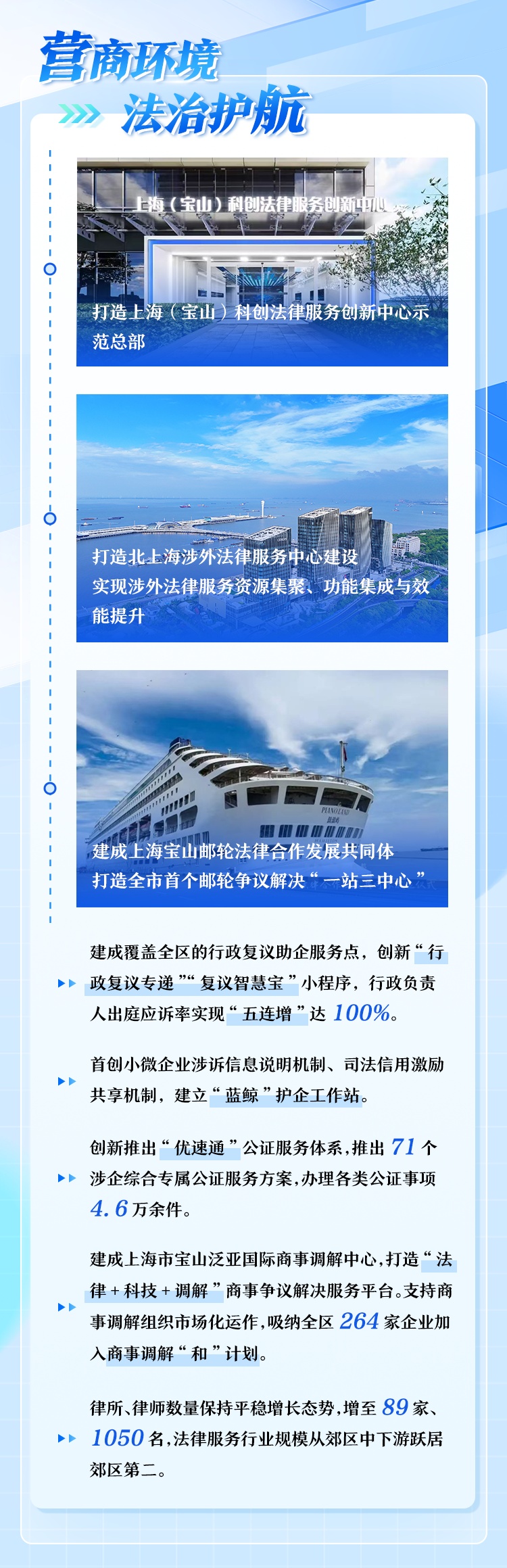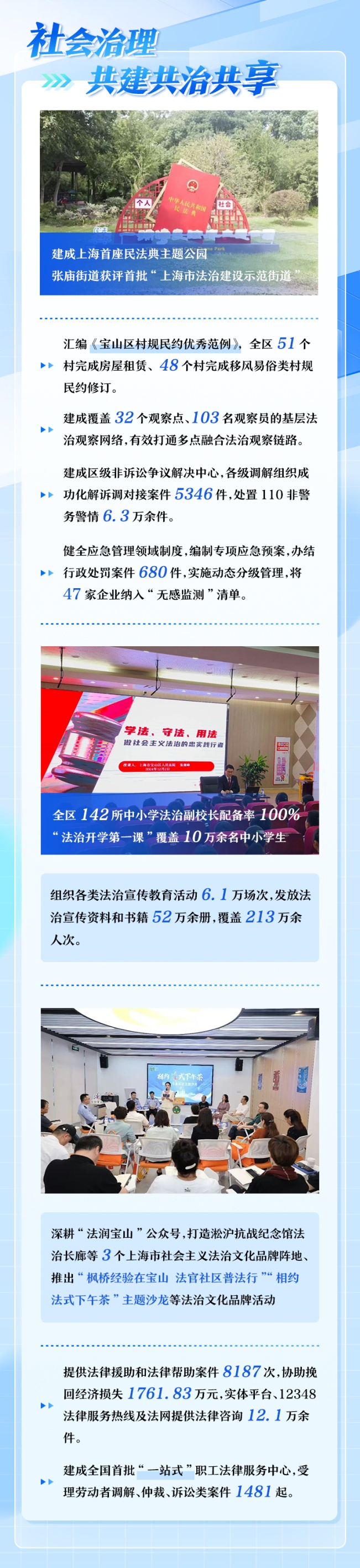 “十四五”收官在即,宝山区坚持法治先行、护航发展,交出了一张机制创新、治理提效的改革答卷: 全国行政复议应诉工作 表现突出集体 全国社区矫正机构先进集体 《构建科技成果转化全链条 法治保障机制》获第三批 全国法治政府建设示范项目命名 “社区矫正人员之家云平台” 获得国家著作权登记 “宝你HUI”政务服务品牌入选全国 “数字政府创新成果与实践案例” “宝你HUI”AI小宝入选全国 “数字城市创新成果与实践案例” “‘宝你HUI’AI小宝: 构建‘AI+数据要素’双引擎驱动的 智能政务服务新范式”荣获 中国信息协会数据要素应用创新大赛 “数据要素赋能数字政府建设” 赛道二等奖 《以教“治”融合模式促进 基层干部治理能力提升》获评 2024年度长三角基层 依法治理十大优秀案例 发布全国首部 《邮轮旅游产业合规指引》 罗泾镇塘湾村、月浦镇聚源桥村 分获第八批、第九批 “全国民主法治示范村(社区)”命名 一系列扎实举措,推动全区法治建设实现从“夯基垒台”到“积厚成势”的重要跨越。