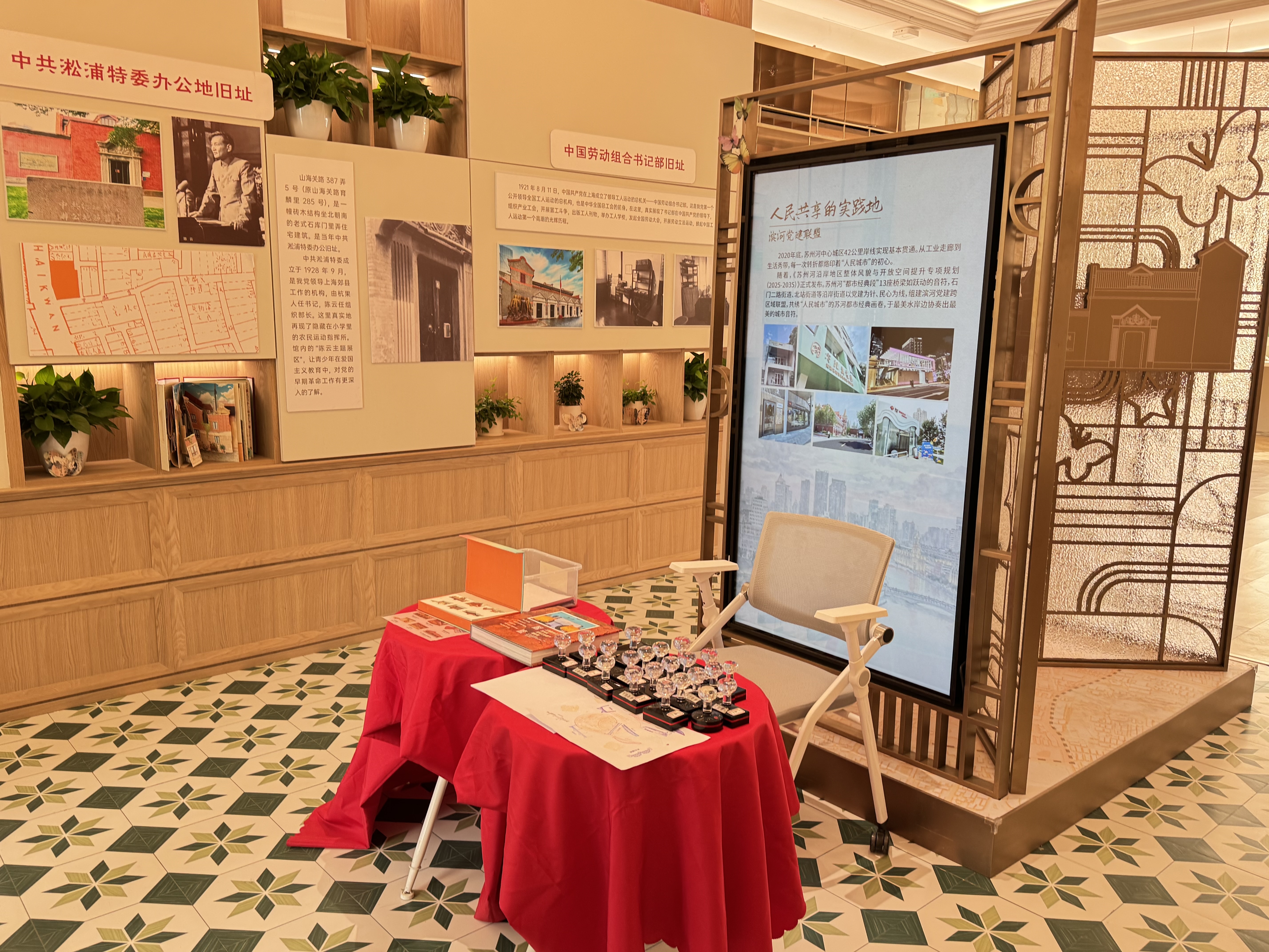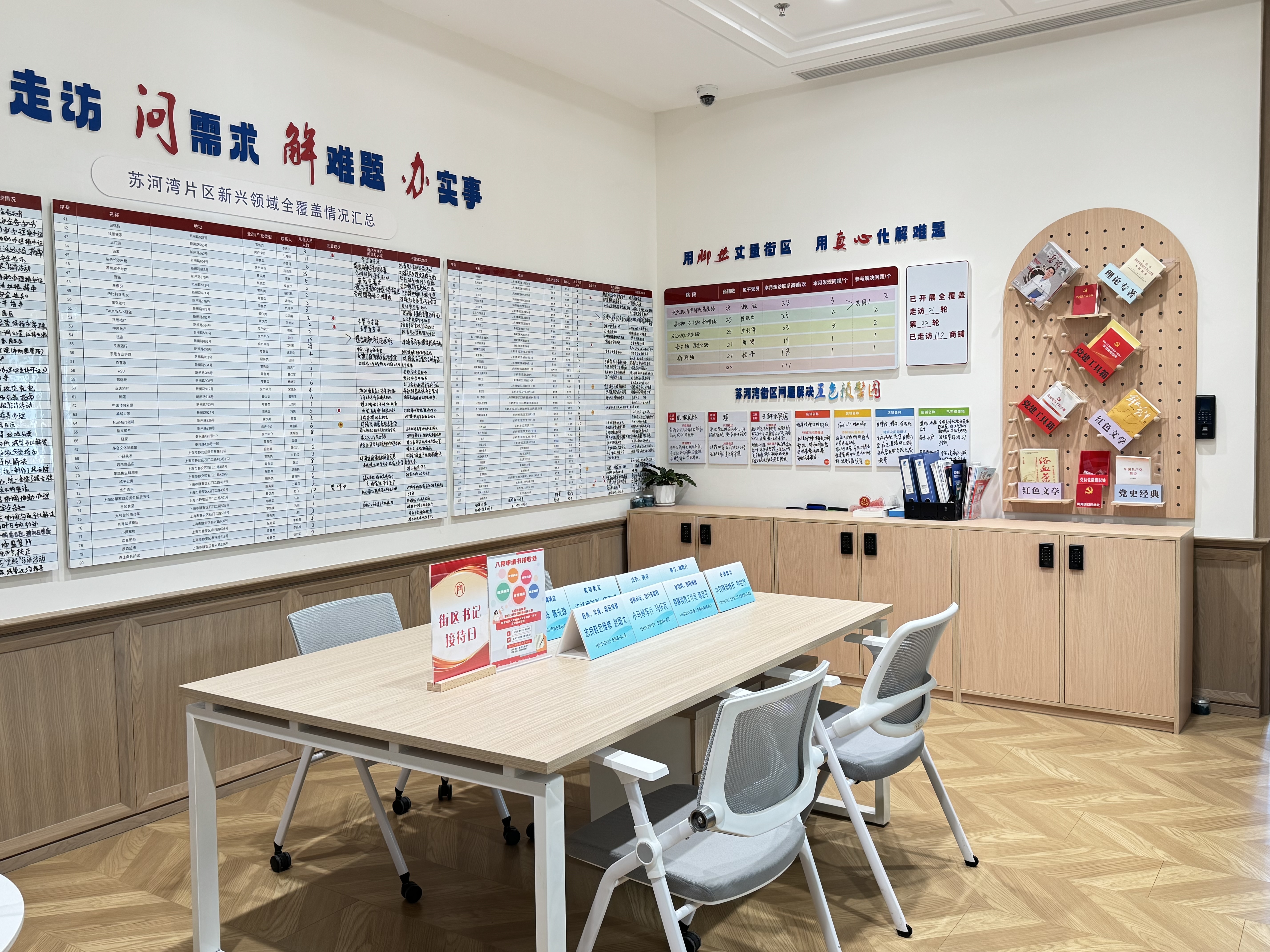 此外,二楼还设有“最美组织生活室”、非诚勿扰客厅、红色微展厅等多个功能空间,将服务功能有机串联,广受好评的电影党课每周三如期进行,企业需要开展座谈、沙龙等活动也可以提前来预约,全都免费开放。党群阵地为文化、艺术、健康、治理、法律的五大类主理人提供免费场地、基础设备支持,使居民们可以在这里获得便捷高效的各类生活服务。
