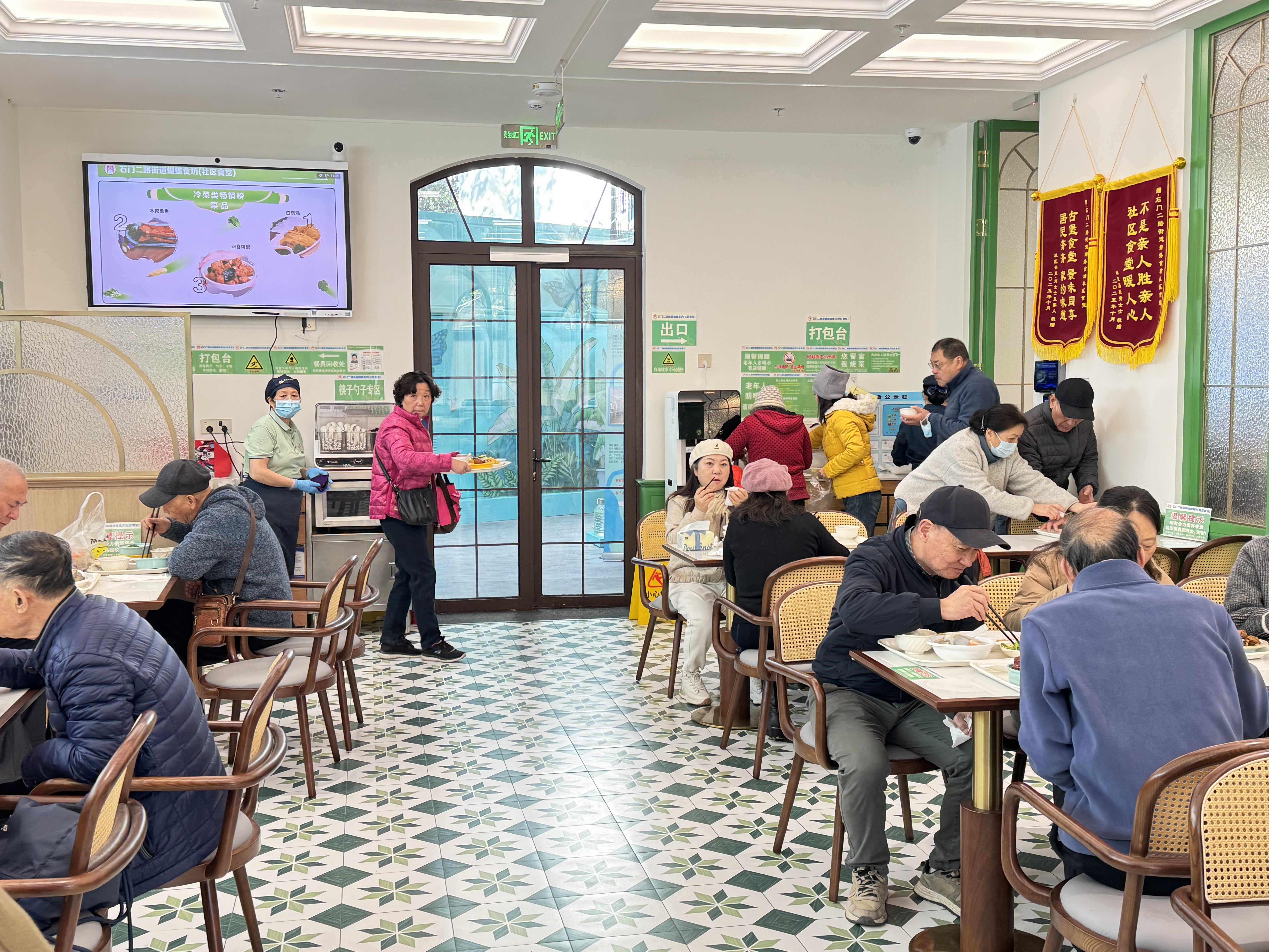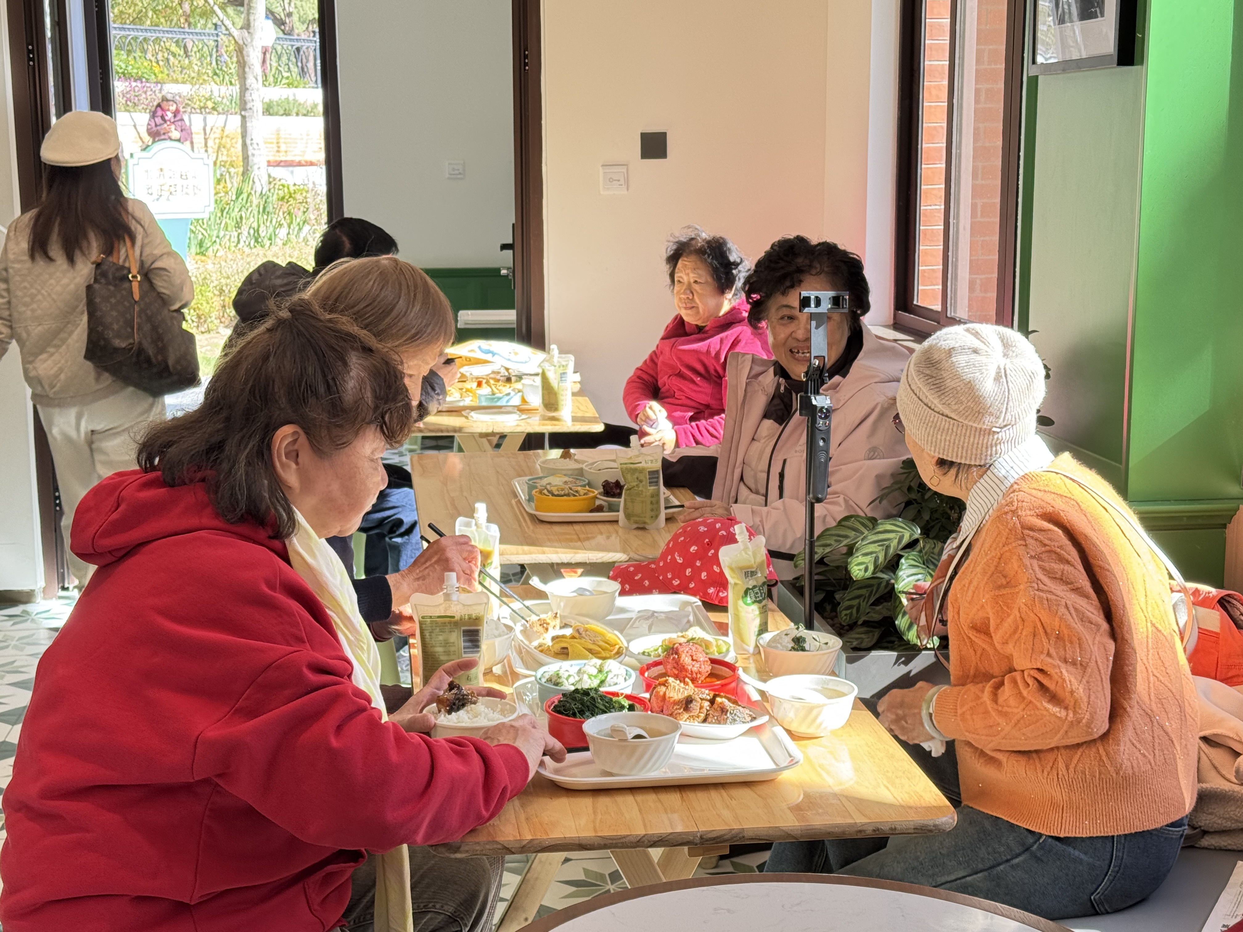 “格个地方,来吃饭真是种享受!里厢环境好,菜还没尝,眼睛就先‘吃饱’了,而且菜的味道都符合我们老年人口味,最重要的是,都不是预制菜,价格也实惠。”背靠优雅的拱形玻璃窗,沐浴着冬日暖阳,杨阿姨对这里赞不绝口,由衷感叹道。今天,她特地约上老朋友,姐妹三人分别从虹口、浦东来静安打卡“最美社区食堂”,拿着手机拍了个不停。“这个食堂的环境名不虚传,到处都很好拍,现在在我心里排名第一!”