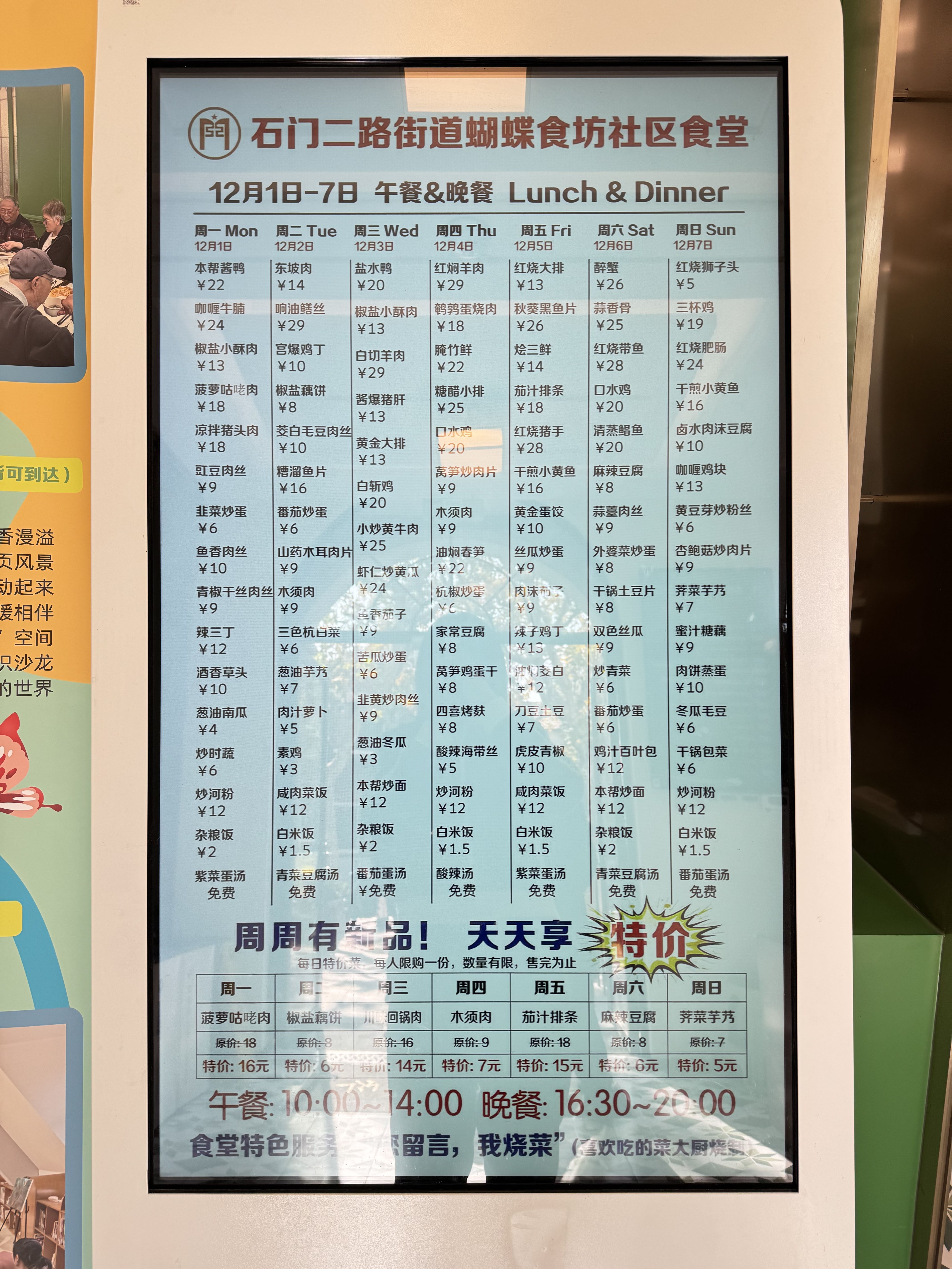 对特殊群体的暖心关怀,也是蝴蝶食坊的一大亮点。具有本市户籍、居住在静安区且已申请助餐服务的老年人可享85折优惠,现役军人、退役军人、优抚对象凭证享受81折优惠。