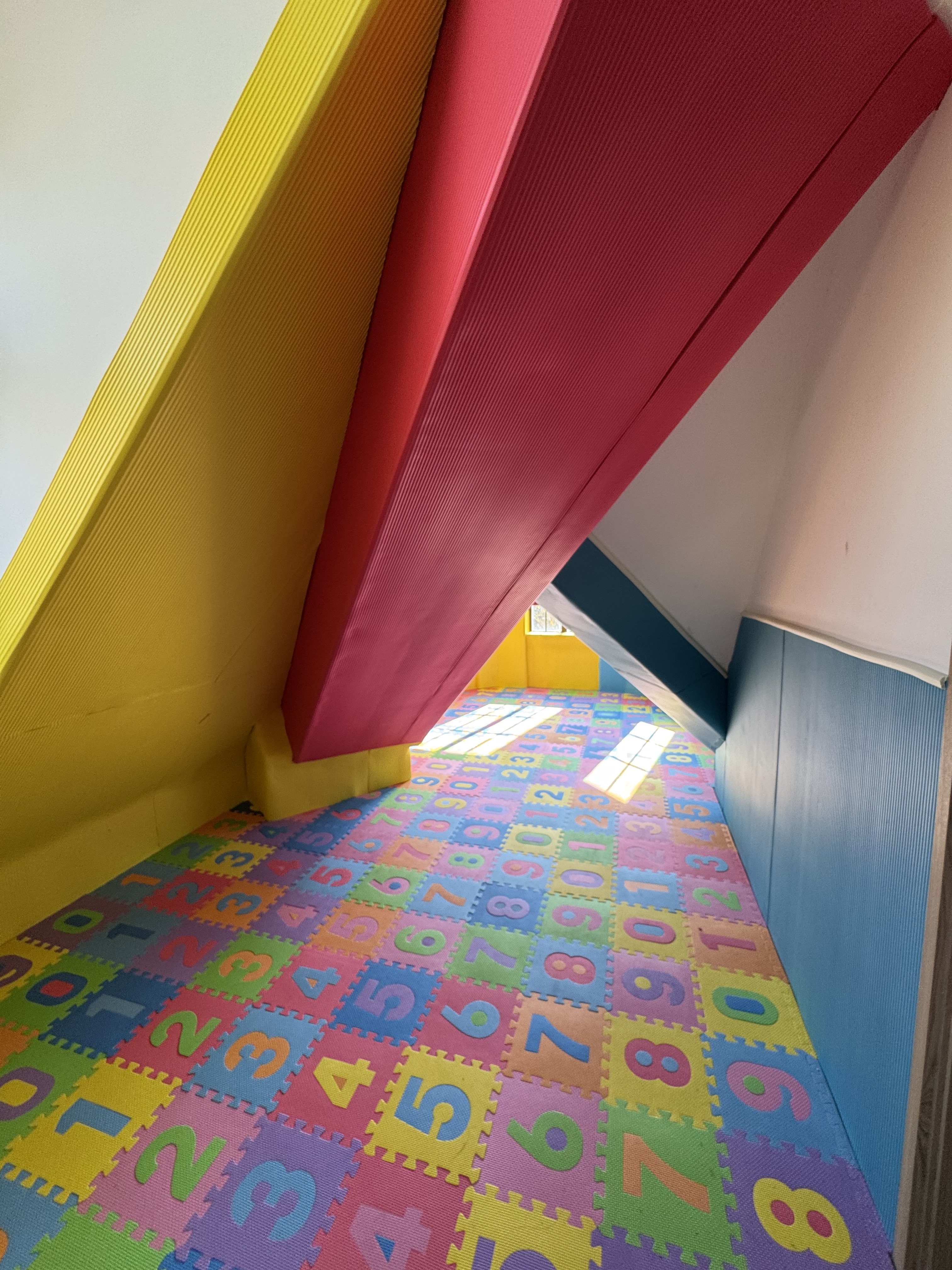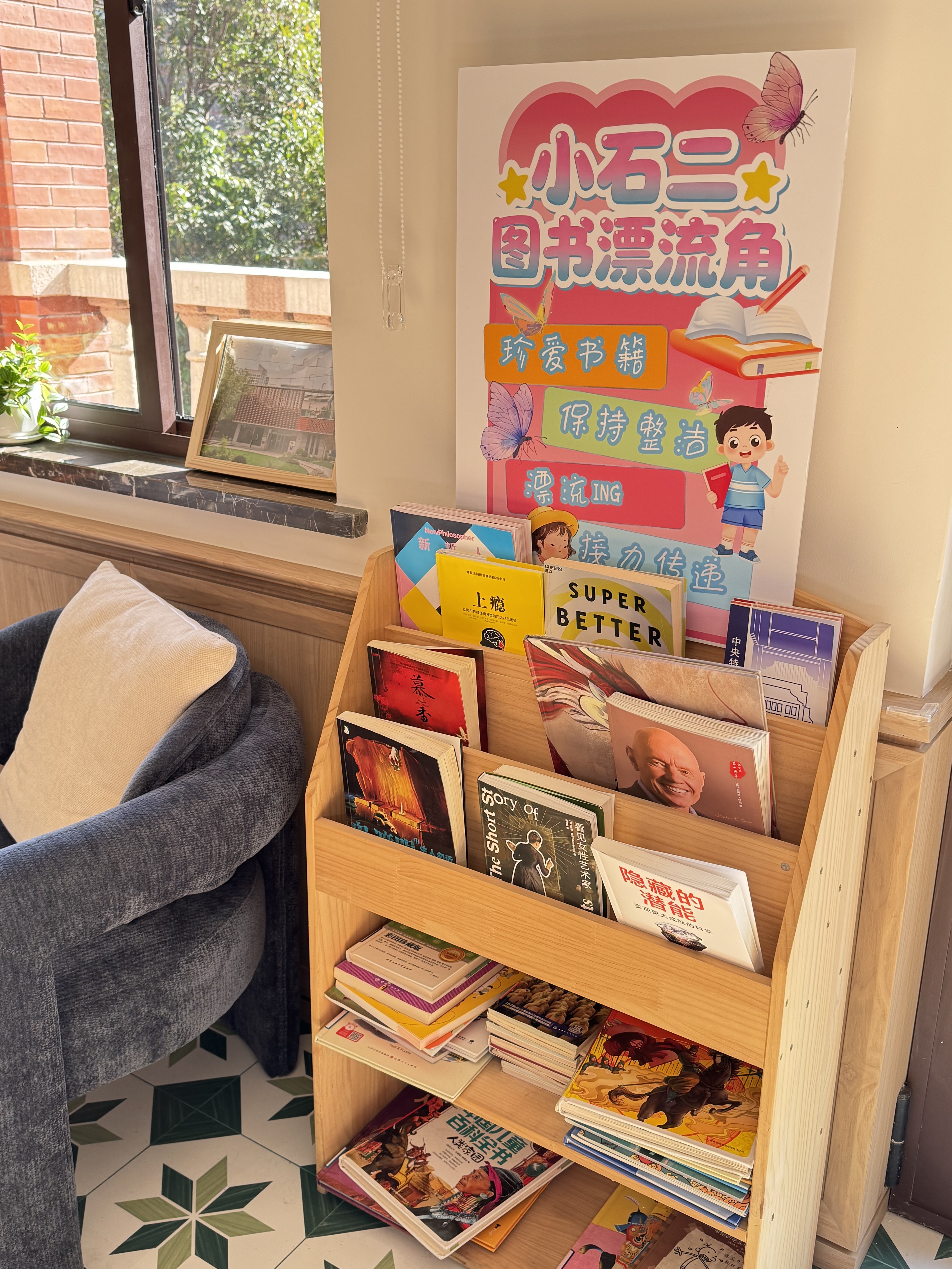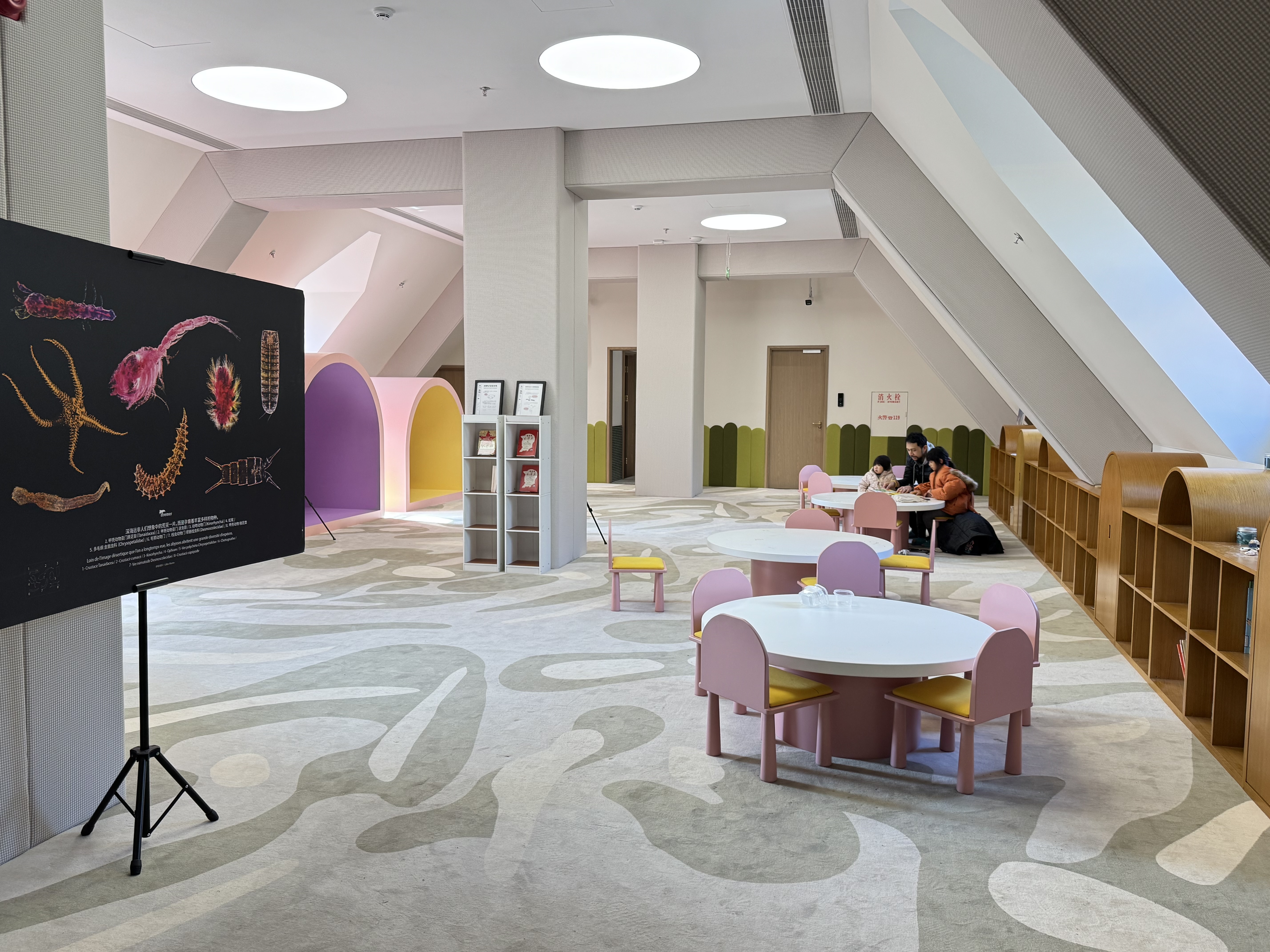 沿着蝴蝶翩飞的楼梯走上三楼,就来到了蝴蝶童坊。宽敞的一整层空间都作为开放式儿童友好空间,室内采用生动活泼、色彩明亮的装修风格,分为亲子阅读角、亲子爬爬乐、混知阅读角和创意美育工作坊等区域,成为附近家长的遛娃好去处。