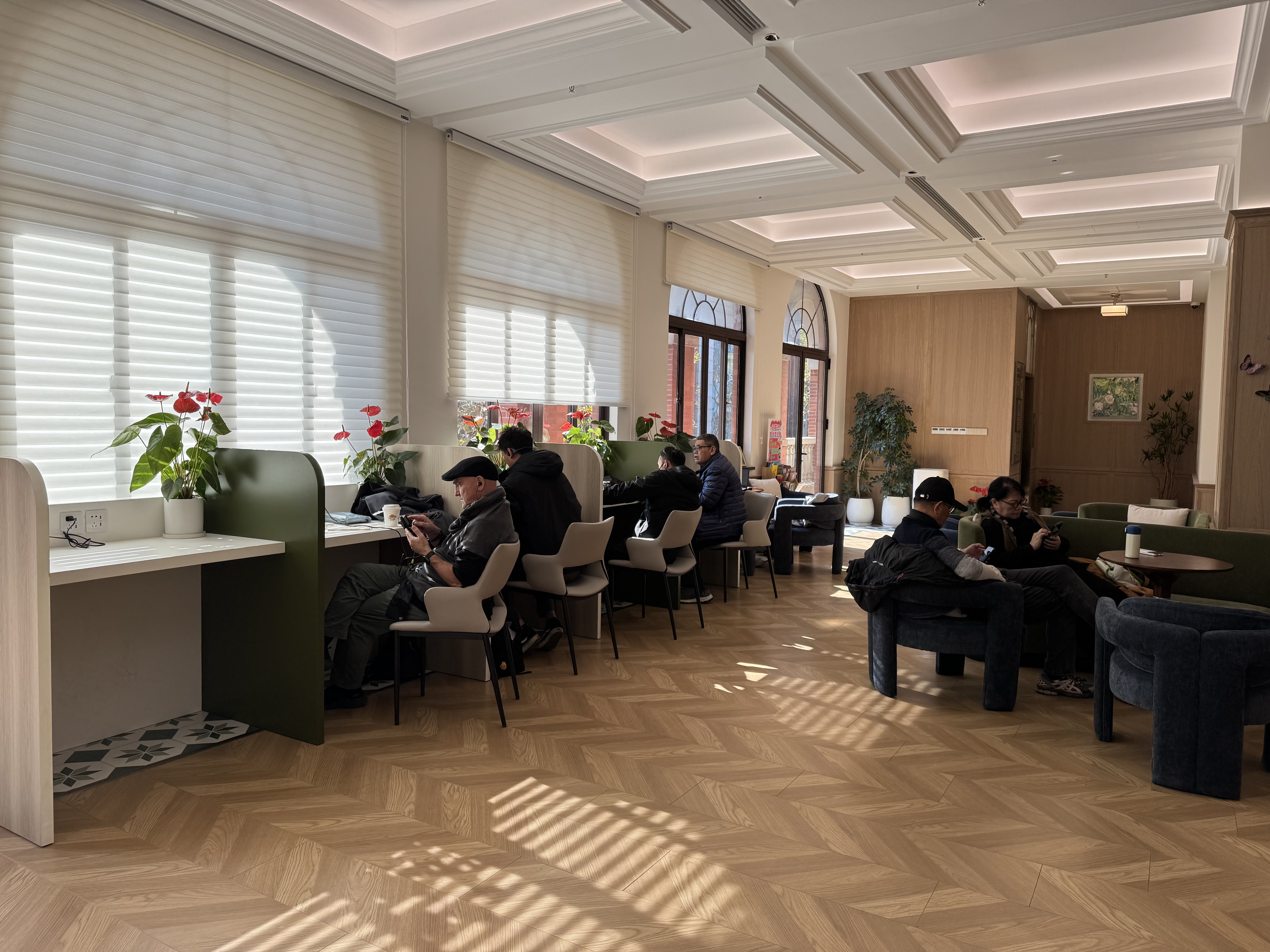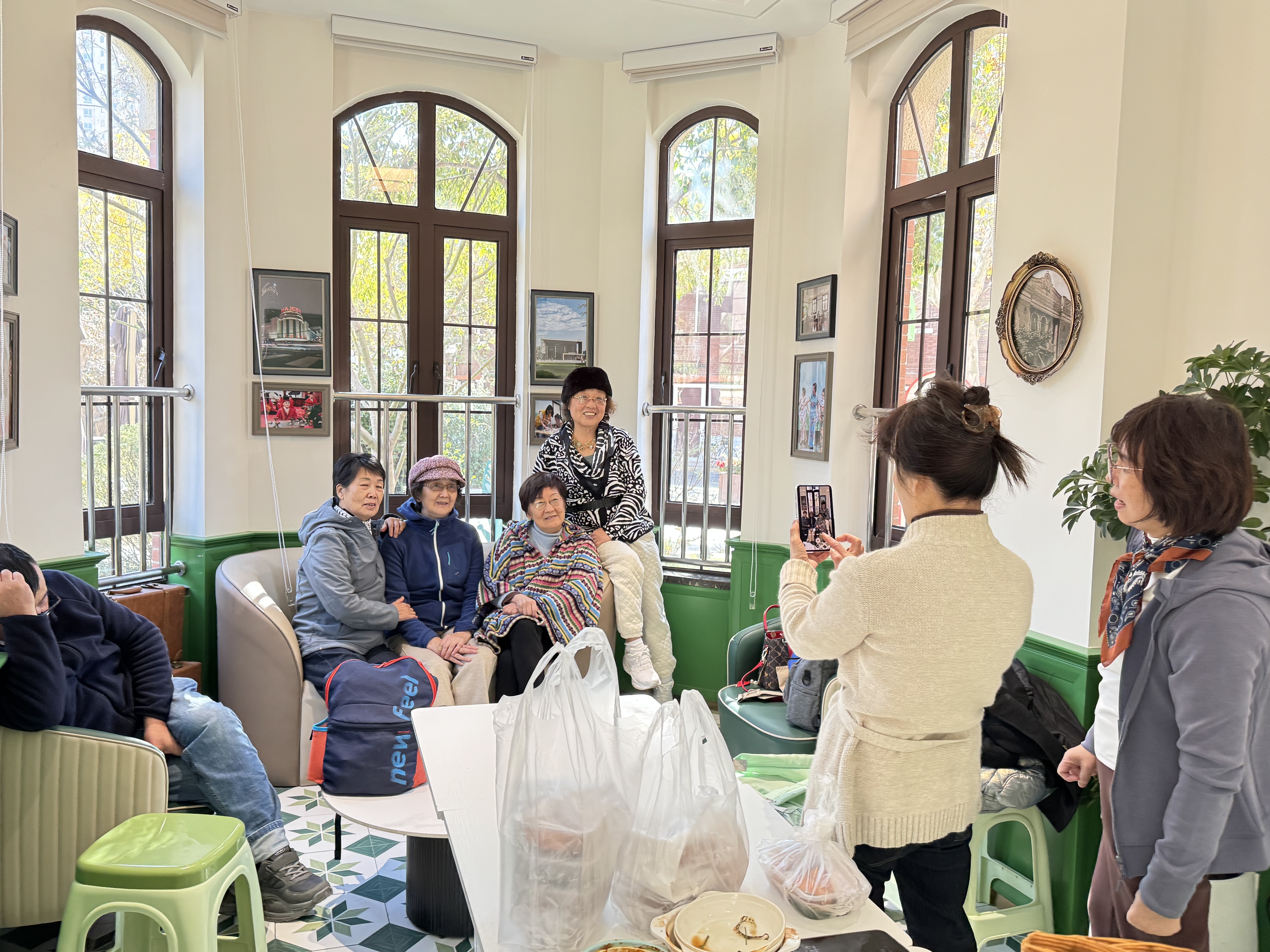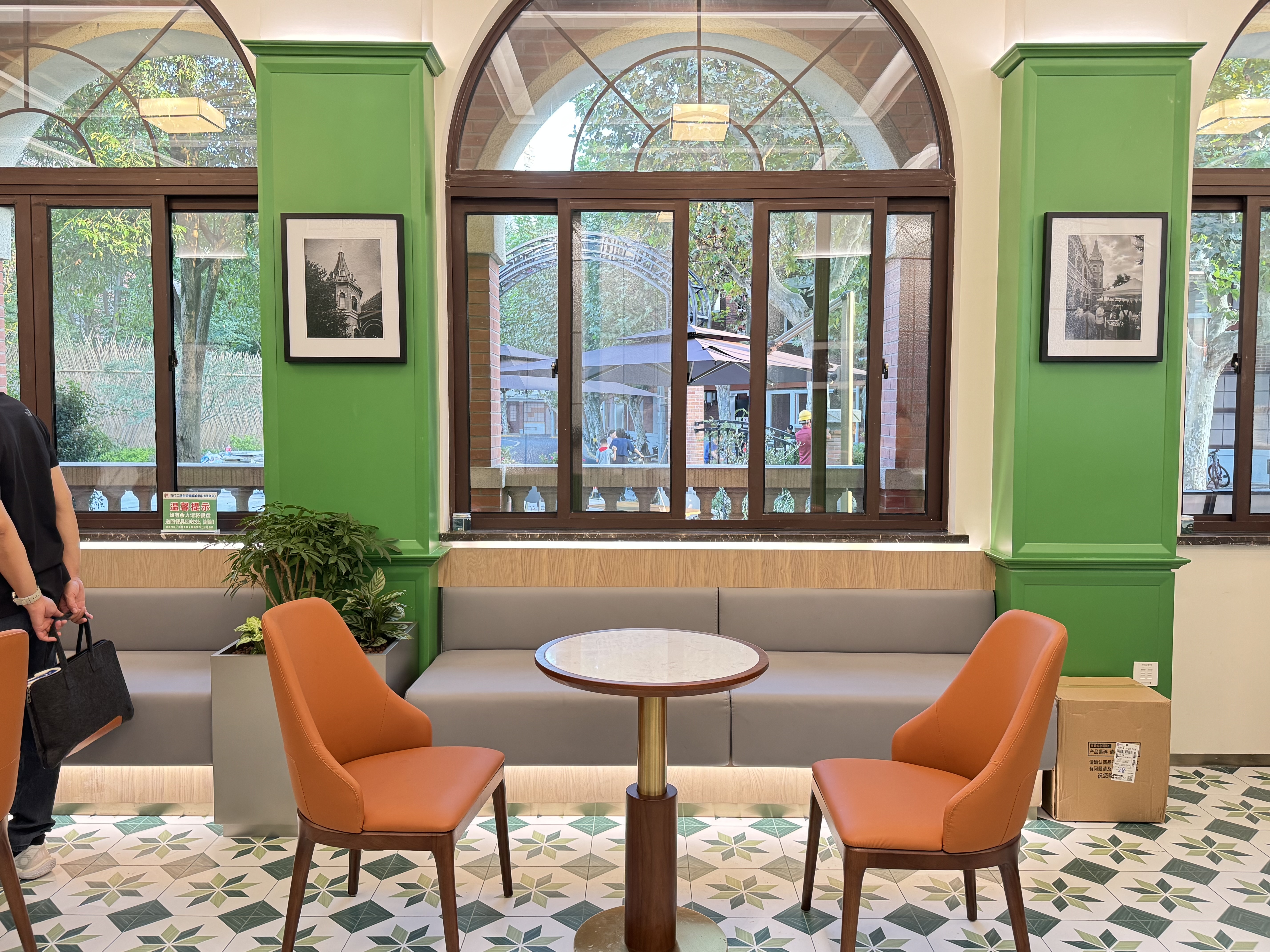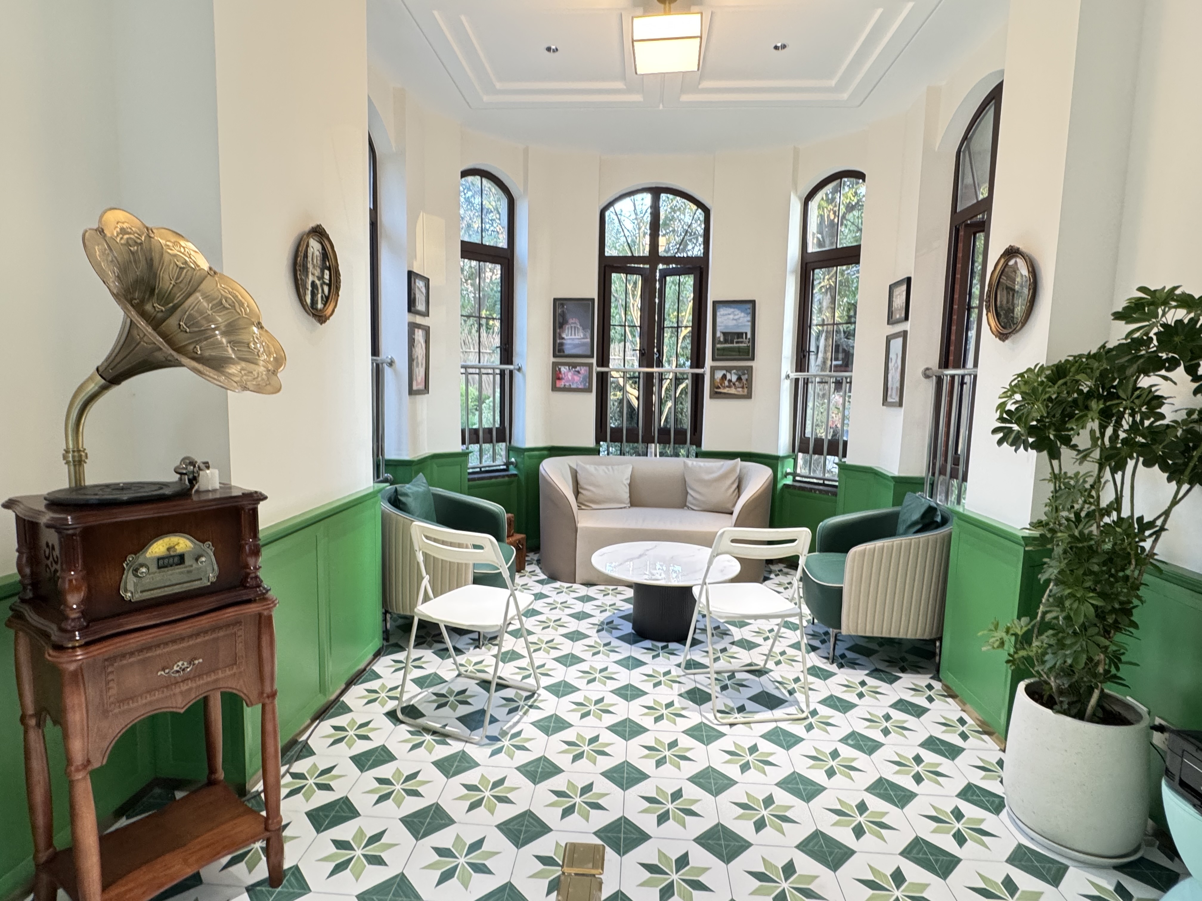 环顾食堂内部,半圆形窗户、花格地砖、绿色墙壁上悬挂的油画,共同营造出小清新文艺感。再往里走,一处像老上海会客厅的静谧一隅,兼具“烟火气与精致感”的海派风情互动空间,集邻里会客厅、自助照相馆、海派风情打卡点于一体。坐在这里吃饭,自然上海腔调十足。