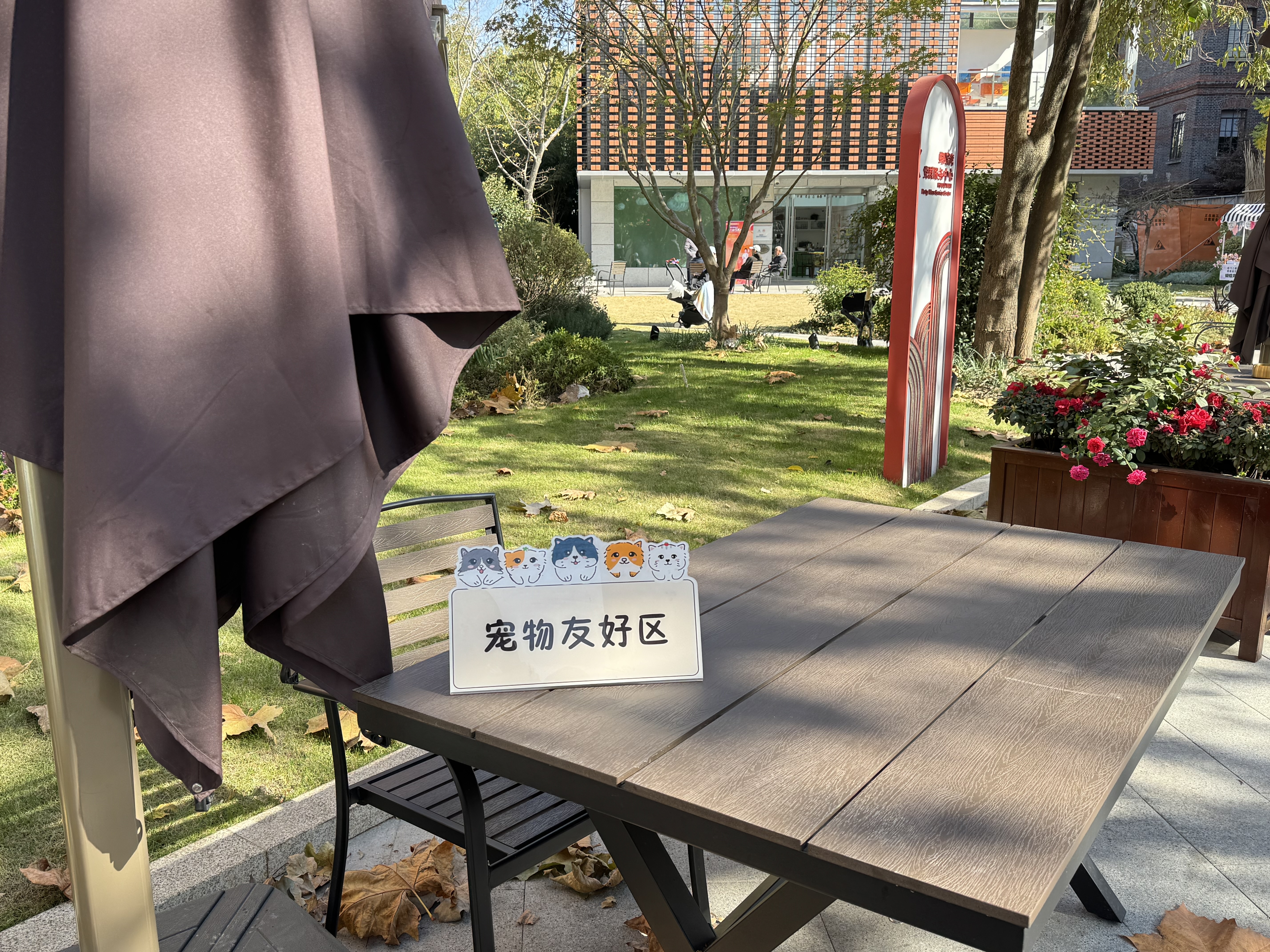 在食堂的户外区域,还摆放着几张餐桌,这里是专门为那些带着“毛孩子”的市民设置的宠物友好用餐区。这个贴心的设计让主人们不必再将爱宠独自留在家中,而是可以一起享受用餐时光。