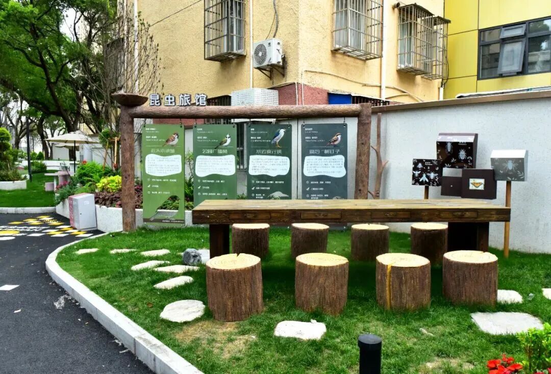 为了改造这个曾经公共活动空间严重不足的老旧小区,宜川路街道通过“居民议事厅”征集居民意见,成功将一片无人管理的内部杂巷,变身为生境花园。项目保留原生香樟等大型乔木,引种多种上海本土植物打造立体绿化带,更精心设置20多处鸟巢、松鼠窝、昆虫箱等“动物旅馆”。如今,这里已成为周边学校开展自然教育的“第二课堂”,定期举办沉浸式的生态实践课程。