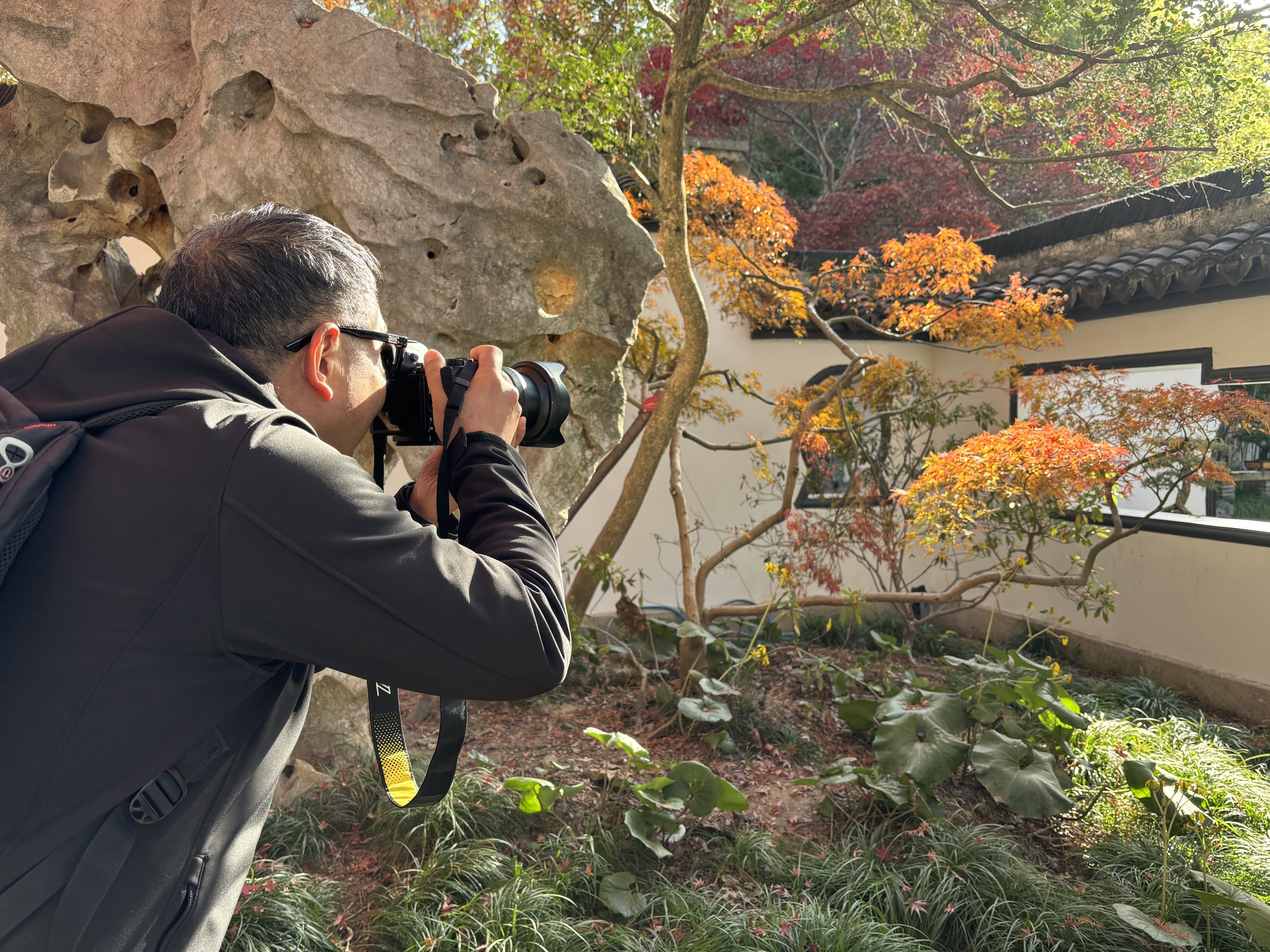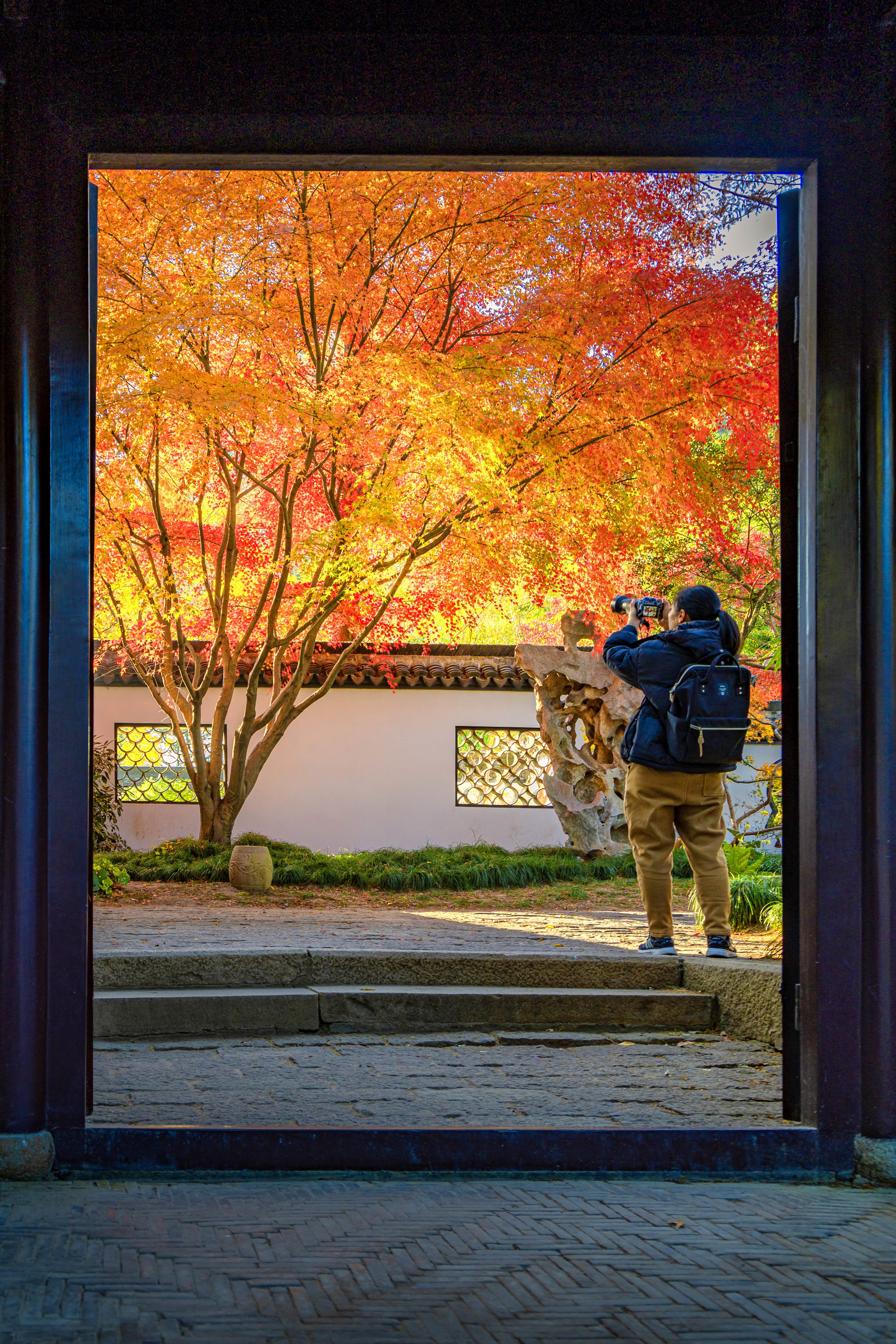 醉白池的枫叶,染红了园林的各个角落。游客在主干道的桥堍、雪海堂庭院、盆景园等处,都可以看到色彩浓郁的景致。“枫树和古典园林的氛围相得益彰,枫叶造型也很别致。我今天特意从浦东过来,就为了记录醉白池的美丽‘枫’景。”游客李先生一边拍照一边说。