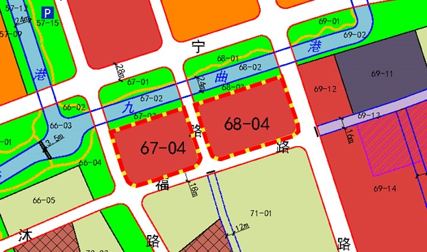 四至范围: 67-04地块东至新福路、南至沐福路、西至沐泽路、北至九曲港,68-04地块东至江桥路、南至沐福路、西至新福路、北至九曲港
