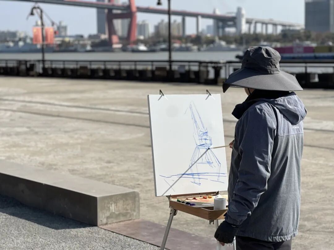 采风现场,不少美术家铺开画布开始创作,有人忙着勾勒杨浦大桥的雄姿,有人则静心感受塔吊的人文底蕴。那些或完整或零散的线稿与色块,将滨江之美定格于瞬息之间。
