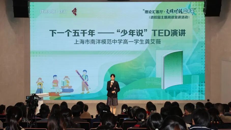前期,市社联已经在南洋模范中学开展了以该丛书第一卷为引的预讲。活动上,来自南洋模范中学的龚艾薇同学带来《下一个五千年》“少年说”TED演讲,从大历史观、文明互鉴两个维度出发,分享了她的学习心得,展现了中国少年的文化自信。