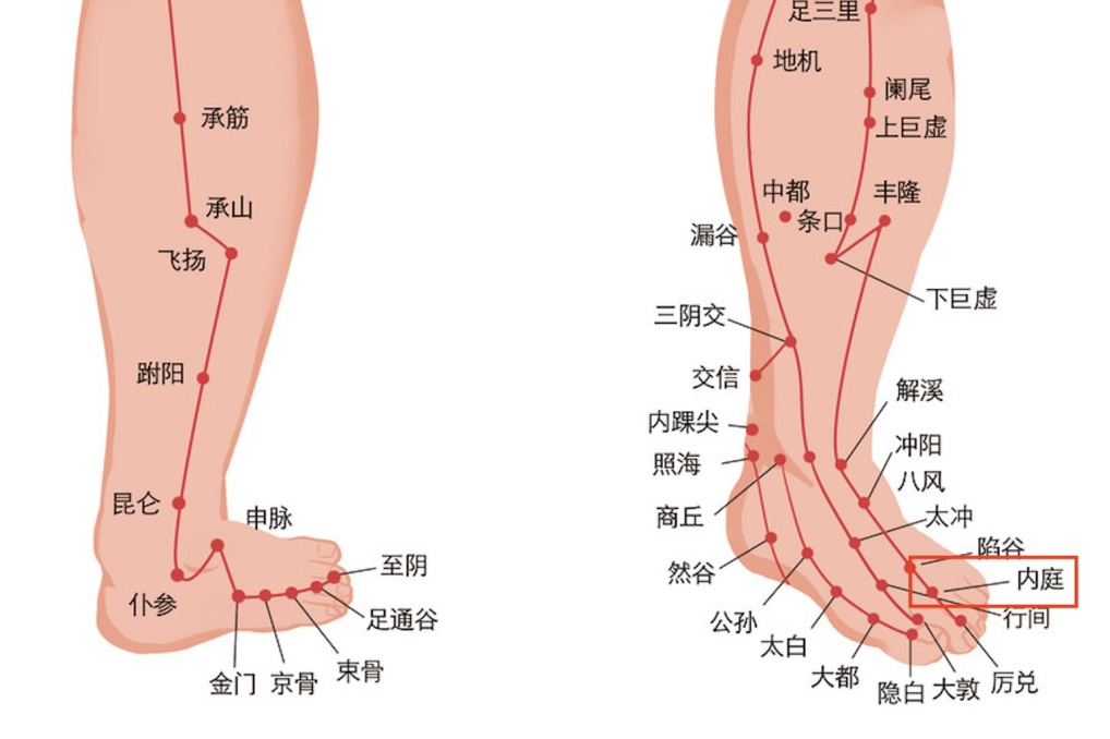 手法:坐位或半躺,用拇指按住内庭穴垂直点按,并顺/逆时针小幅揉动,每侧 1–3 分钟。