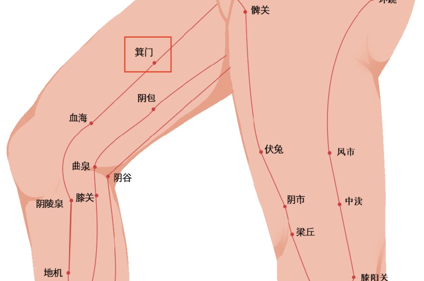 位置:大腿内侧,从膝内侧上方的血海穴,沿大腿内侧向上约 6 寸,在靠近腹股沟的一处凹陷,即为箕门。