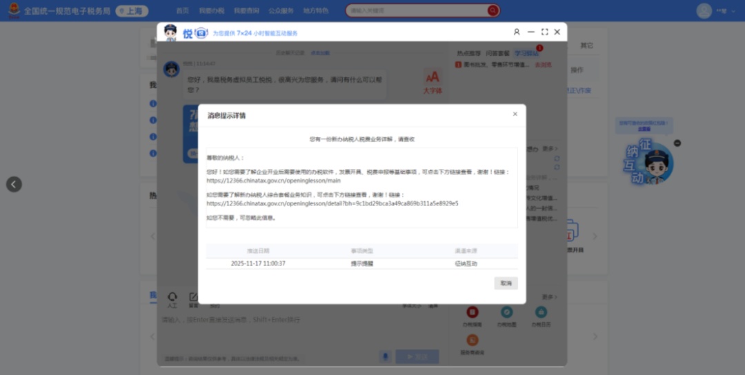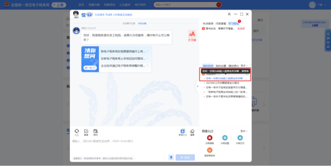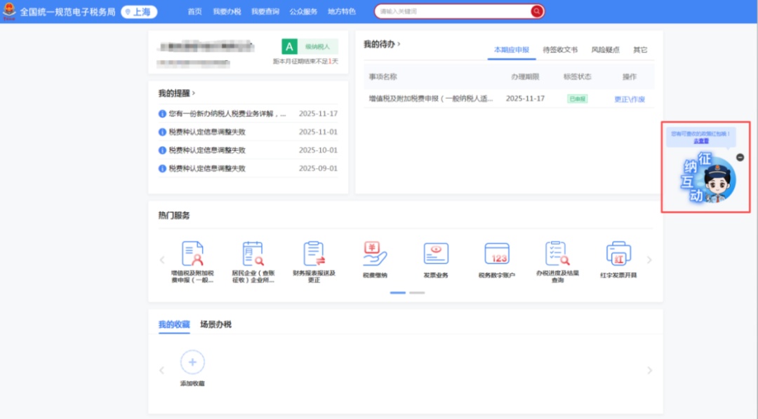 登录电子税务局后,点击右侧的【征纳互动】图标进入征纳互动界面,点击右方【我的消息】-【消息提示】模块,点击对应内容可显示具体优惠政策信息。