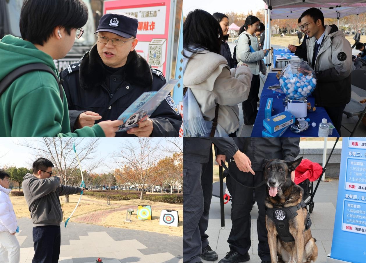 作为本次活动的核心亮点,嘉年华以“寓教于乐”为核心设计理念。学校、松江公安分局大学城派出所和国信证券在现场设置多个互动体验区,同学们踊跃参与“反诈知识趣味抢答”,在你追我赶中巩固反诈常识;“反诈投壶”将传统游戏与反诈标语相结合,投中即可获得定制纪念品,让反诈理念在玩乐中深入人心。公安警示宣传区更是人气爆棚,警队装备展示让同学们近距离感受执法力量,警犬的精彩表演赢得阵阵欢呼,还有民警面对面答疑解惑破解同学们遇到的反诈困惑。