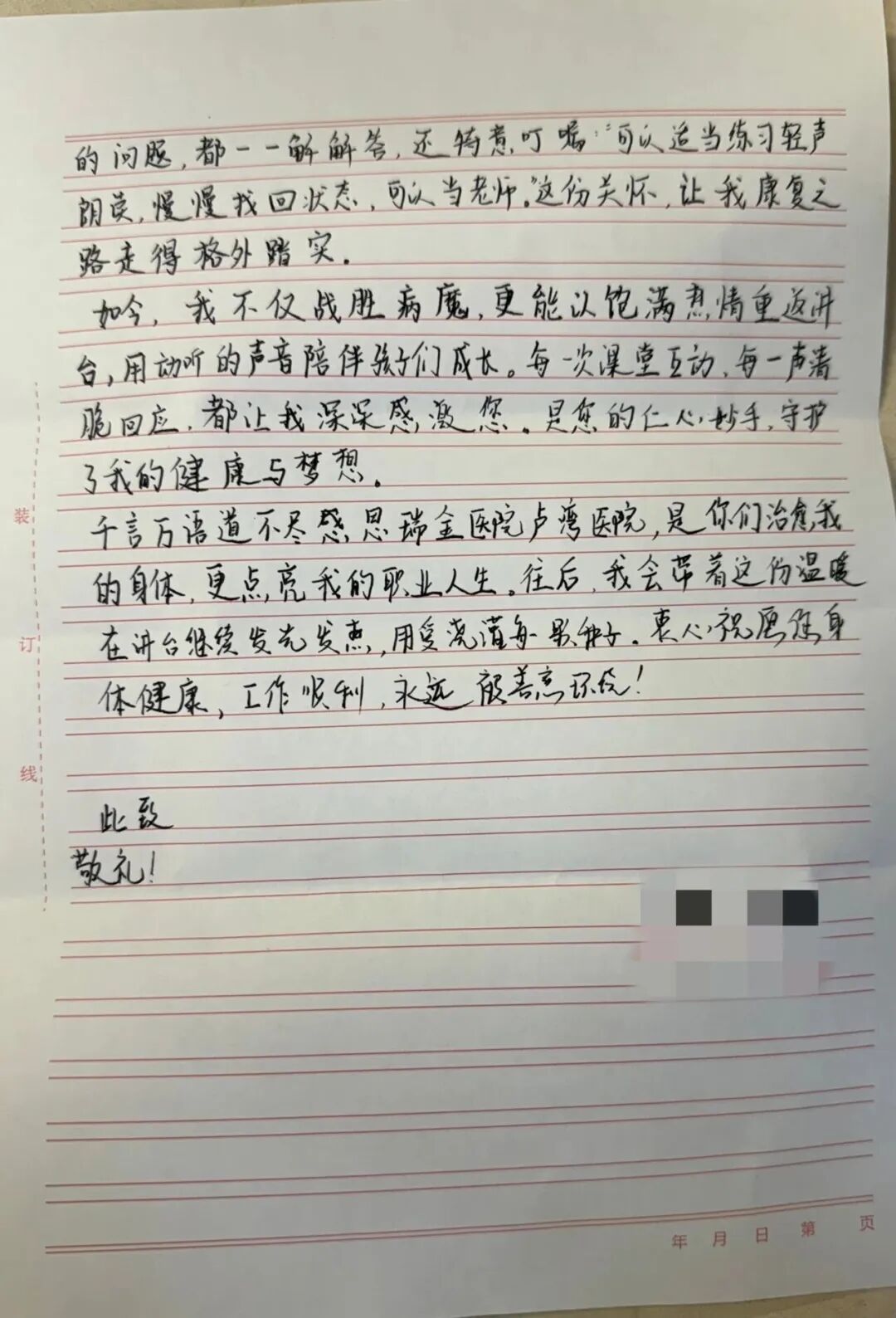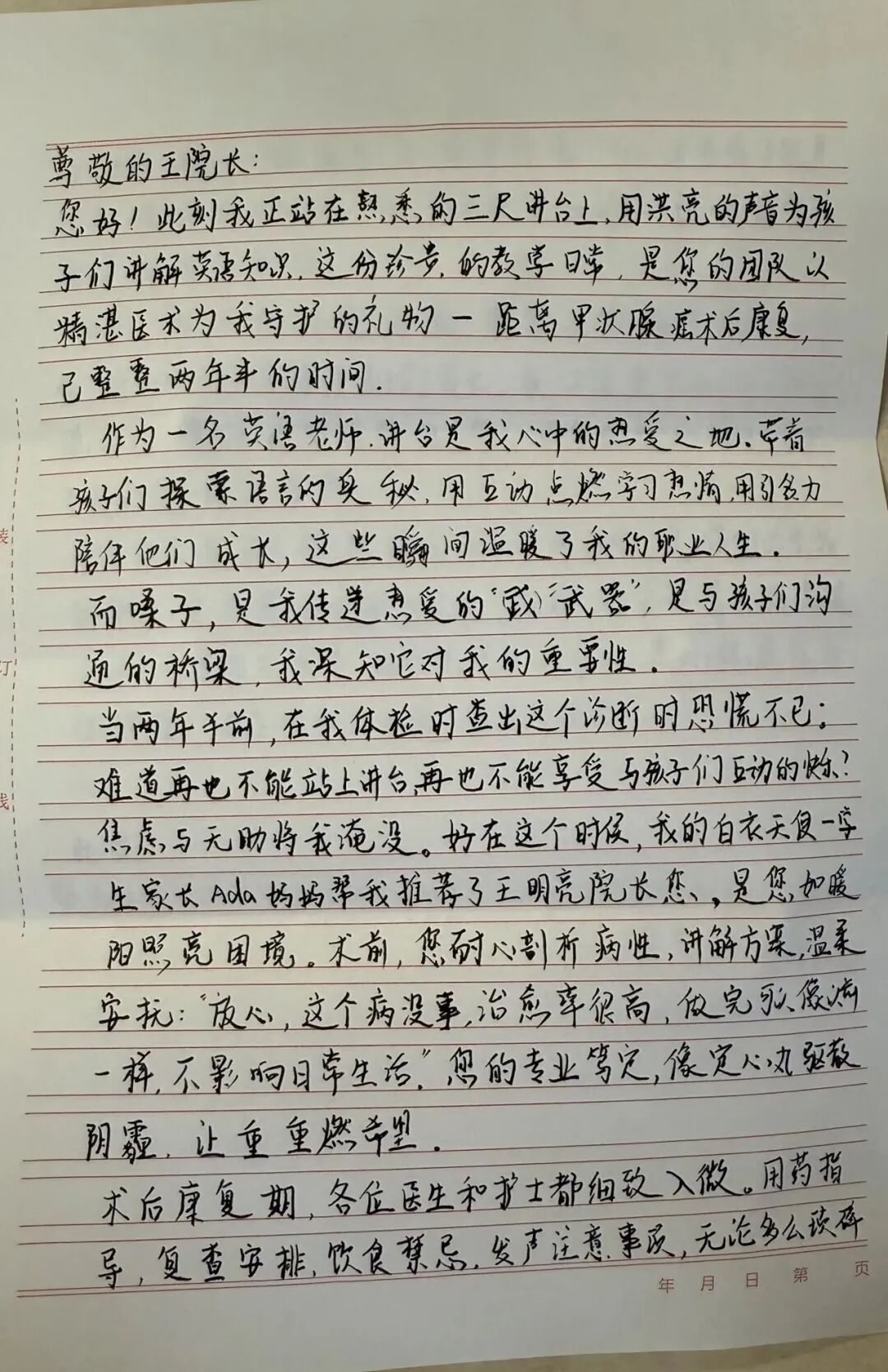 近日,瑞金医院卢湾分院收到一封饱含深情的感谢信,送信人是一位曾与疾病顽强抗争、如今已重返讲台的英语老师杨老师。时隔两年半,她再次来到王明亮副院长的门诊,只为亲手递上这封感谢信,当面说出那句“感谢您给了我第二次生命”。