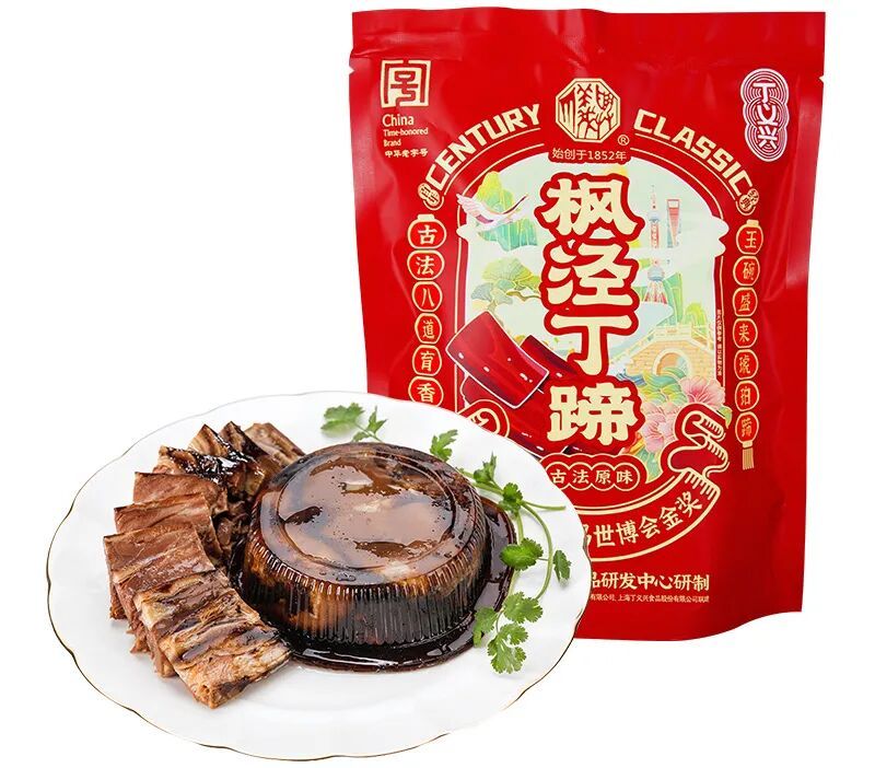枫泾丁蹄(上海丁义兴食品股份有限公司):上海金山区的传统名点,始于1852年(清咸丰二年),由丁清仑兄弟创立的“丁义兴”酒家首创,已有170余年历史。这款美食以新鲜猪蹄为原料,经八道工序精心制作,融合百年老卤与传统火候技法。