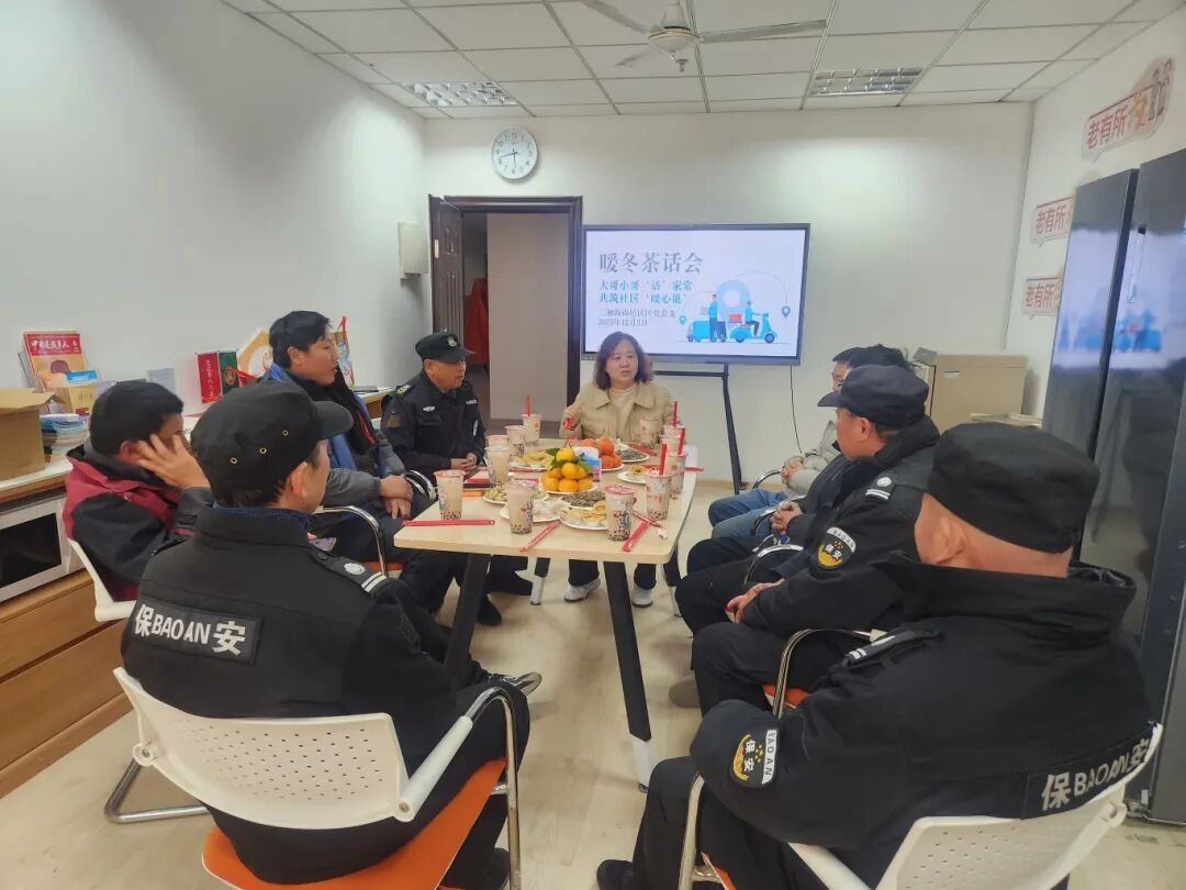 体检结束后,一场氛围轻松的茶话座谈会拉开帷幕。水果点心、热茶暖意,瞬间拉近了彼此的距离。居民区工作人员不仅介绍了“哥俩好”品牌内涵,更向在座的“哥俩”发出了诚挚邀请——希望“哥俩”发挥“移动探头”的优势,成为社区治理的前哨兵。随后,大家打开了话匣子。快递小哥反映了别墅区红砖路长青苔易打滑、高层门禁难进等实际困难;保安大哥也分享了平衡安全管控与便民服务的心得。针对这些诉求,工作人员一一记录,并现场商讨解决方案。 现场最动人的,是中通快递郝师傅分享的小故事。他说保利5号楼有位腿脚不便的独居老阿姨,他每次送完快递,都会顺手帮老人把门口的垃圾带下楼。“这只是举手之劳,但往往这样的小事,让我们和居民之间建立了信任。”郝师傅朴实的话语,道出了服务的真谛。