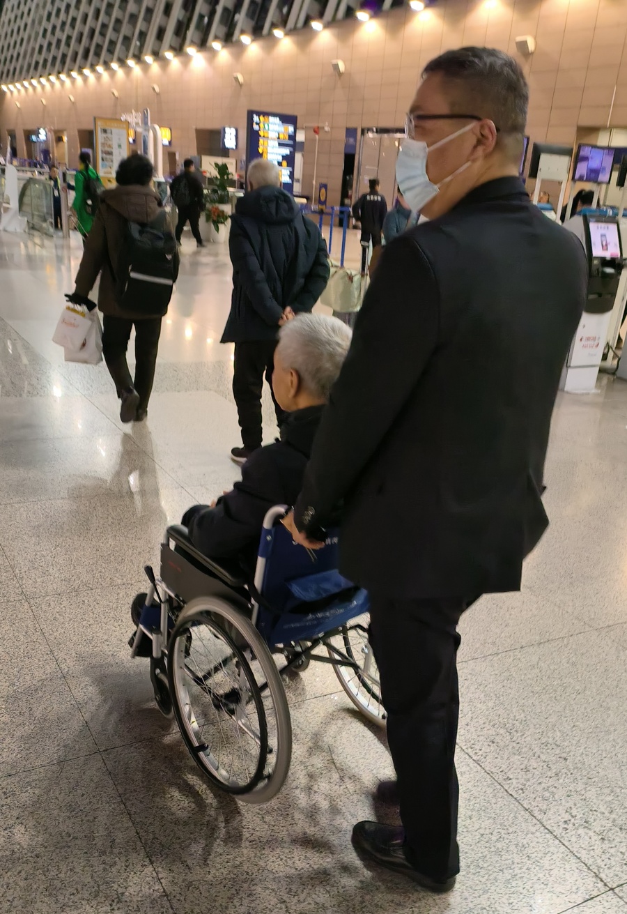 我马上拨打了浦东机场的服务热线,机场方面核实了我和爸爸的身份信息后,和我约定好了时间。离沪航班起飞时间是早上6点25分,我们凌晨四点半到达机场,工作人员已经在服务台等待。工作人员一路用轮椅推着爸爸,遇到坡道还会将轮椅反过来推。把爸爸放下轮椅的那一刻,我情不自禁向他鞠了一躬。