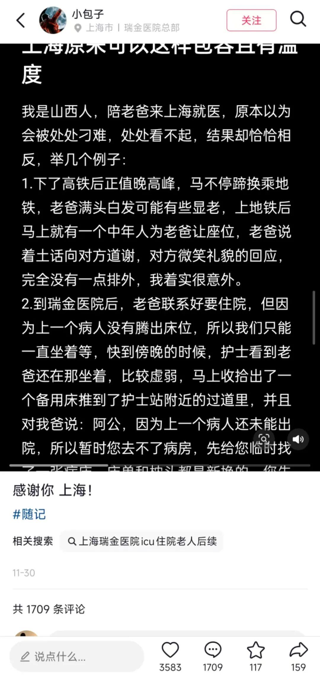 有新上海人留言:“这个城市只是比较有边界感,但是不缺温暖。一个在上海生活三十年的新上海人留。”还有网友分享了自己的经历:“我爸爸也是心外住瑞金医院,我也把气垫床给了旁边的病友家属,一个善举会影响到别人的心情。”