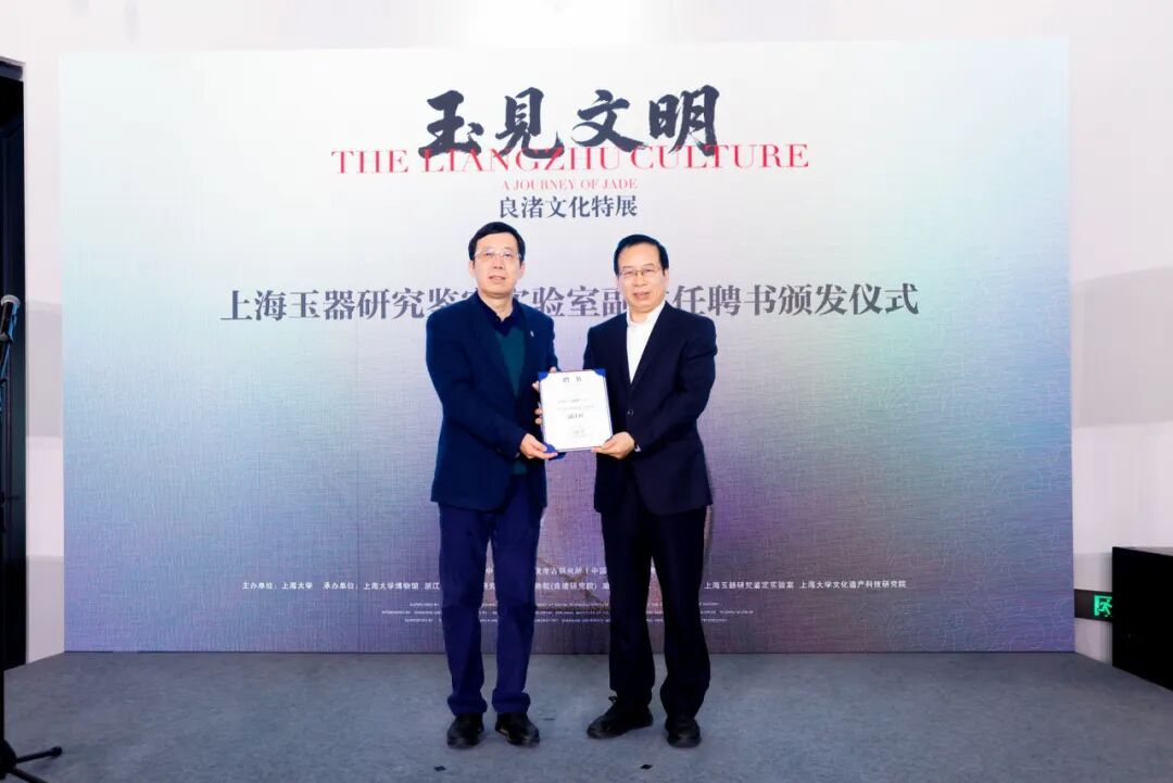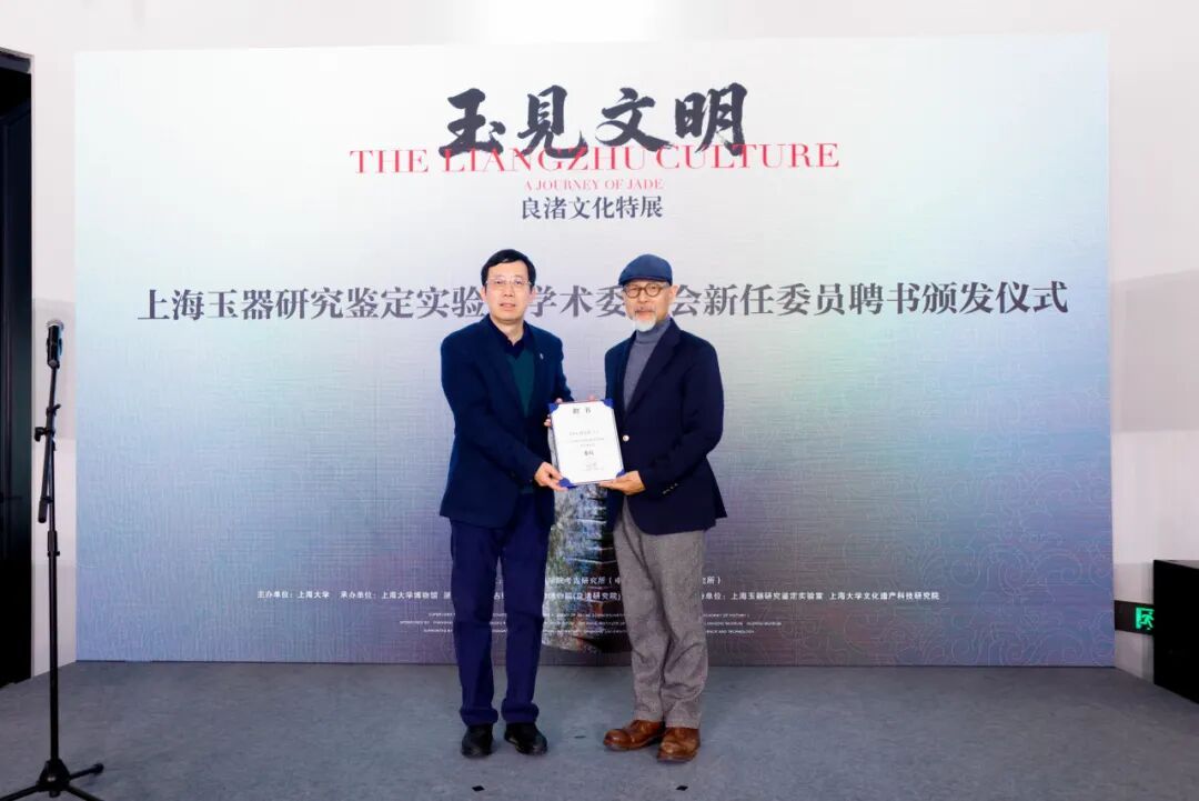 开幕式现场还同步举行了上海玉器研究鉴定实验室学术委员会新任委员聘任仪式与实验室副主任聘任仪式。中国科学院院士张统一受聘为上海玉器研究鉴定实验室共同主席,良渚博物院(良渚研究院)院长徐天进、浙江省文物考古研究所所长方向明、英属哥伦比亚大学人类学系教授荆志淳受聘为上海玉器研究鉴定实验室学术委员会委员,上海大学特聘教授马萧林受聘为上海玉器研究鉴定实验室副主任。