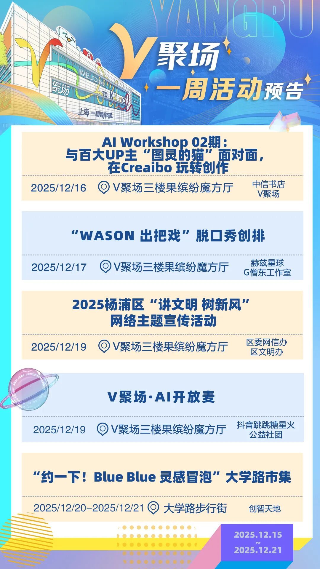 与千万粉丝“UP主”面对面互动,和B站、抖音、小红书等互联网大厂座谈交流,与AI领域创始人探讨人工智能发展新趋势……在杨浦V聚场,随时都有最前沿活动等你来打卡。无论你是互联网从业者,还是创意玩家……这里都将成为你迸发灵感的“能量场”。V聚场12月15日-12月21日一周活动预告来啦!快来碰撞灵感~