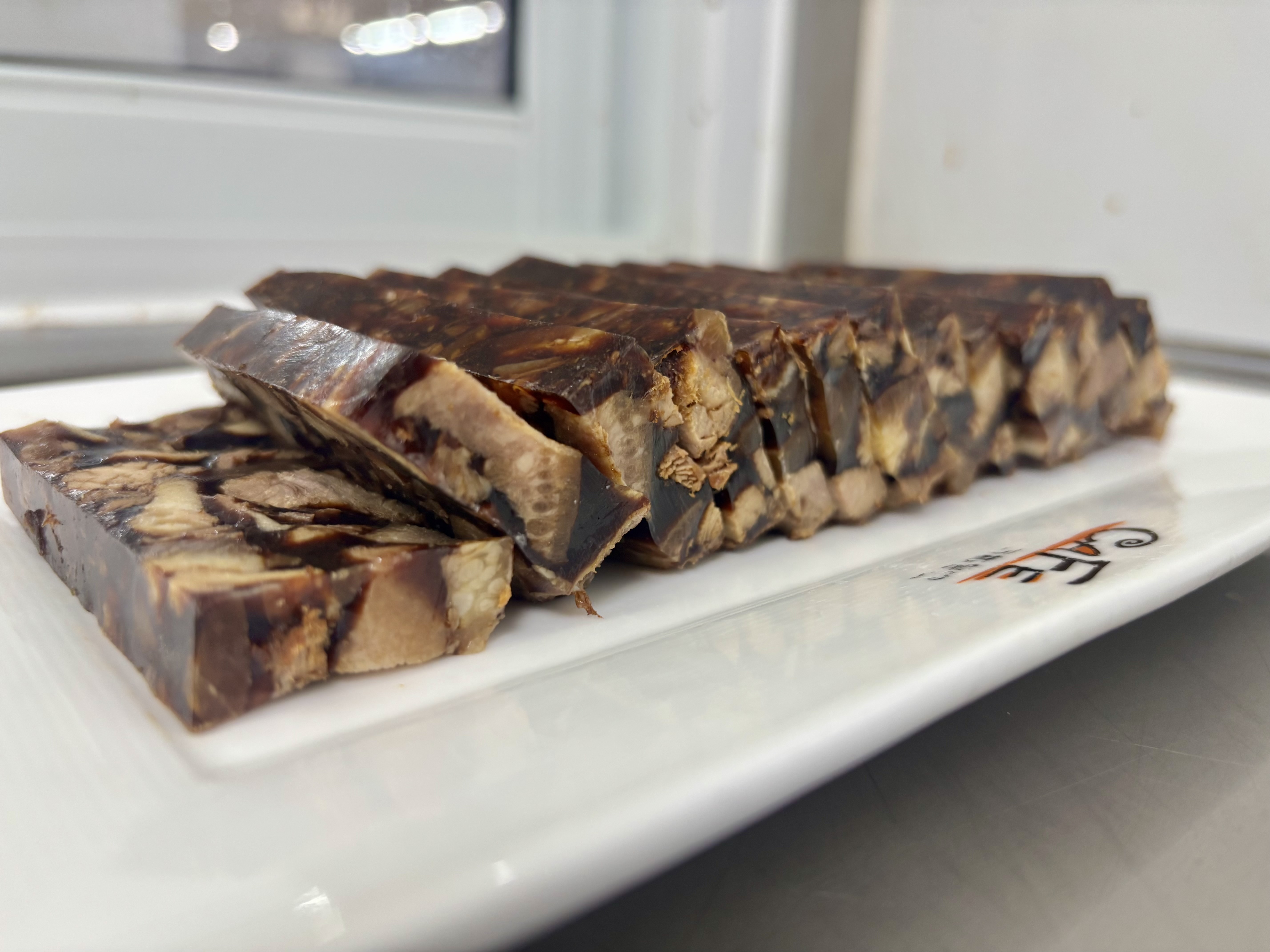 “我们没有用任何添加剂,全靠食材本身的胶原蛋白凝固。”拥有十多年冻肉制作经验的兰桥食堂经理陈连辉介绍道。他认为,火候与时间会决定最终口感:蛋白质要完全溶出,冻肉才会Q弹、香味饱满;而在取出骨架后追加的一段加热,能充分逼出深层的猪膏香,让风味更厚实。