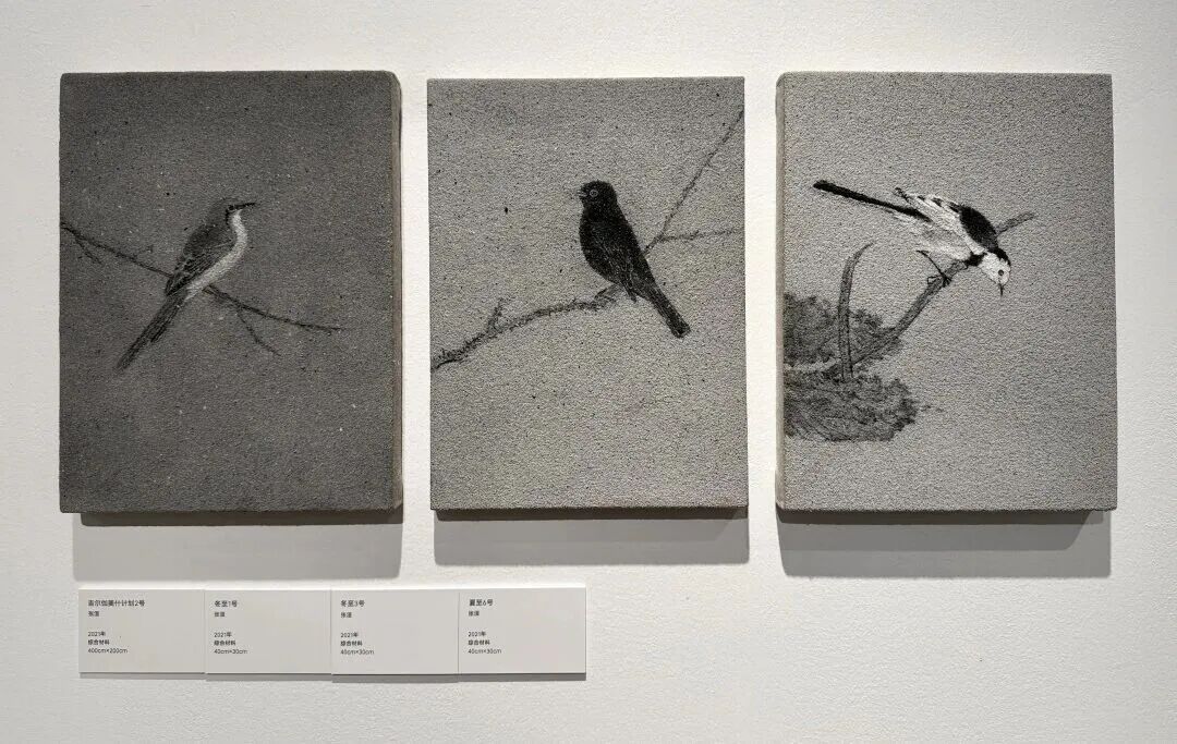 张洹创作的香灰花鸟画系列,是对中国传统山水花鸟画体系的创新性探索,尤其汲取宋代院体花鸟的严谨法度与精神内核,在此基础上实现双重突破:其一为构图语言的重构,打破传统花鸟固有的布局范式,赋予画面当代视觉叙事逻辑;其二为材料媒介的革新,以“香灰”这一非常规艺术材料为核心载体,利用其独特的质感、肌理与精神隐喻,构建出区别于传统笔墨的视觉表达体系。