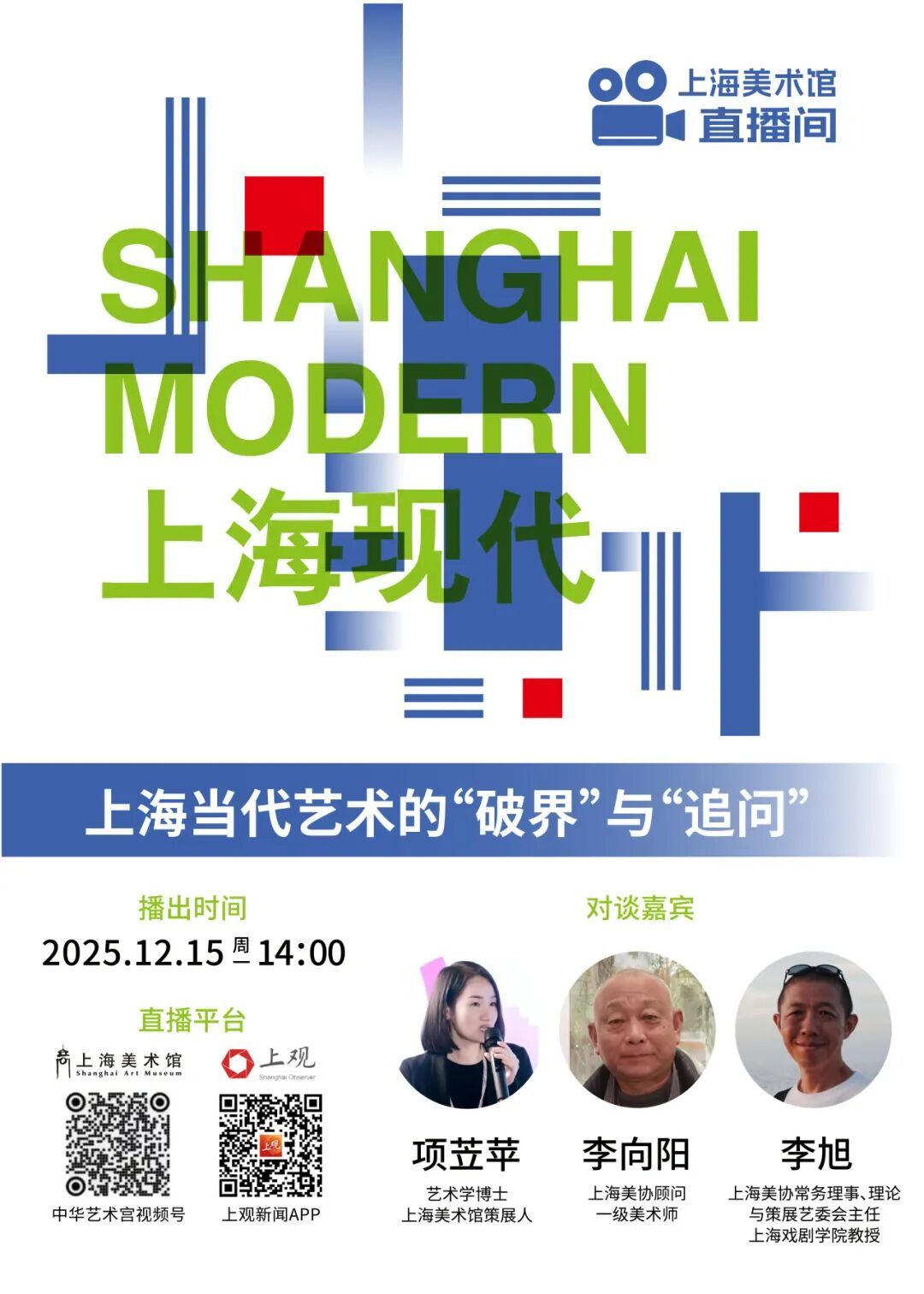 李向阳,李旭与项苙苹将坐镇上海美术馆直播间,展开一场关于 “破界”与“追问” 的深度对谈。
