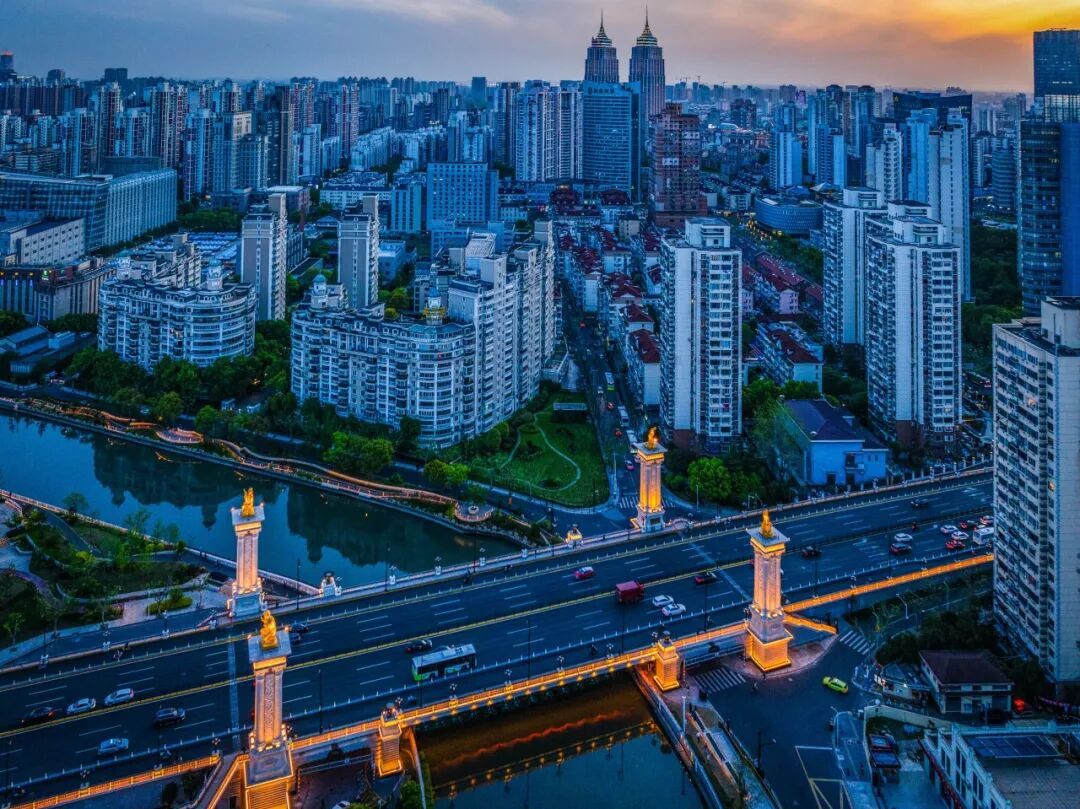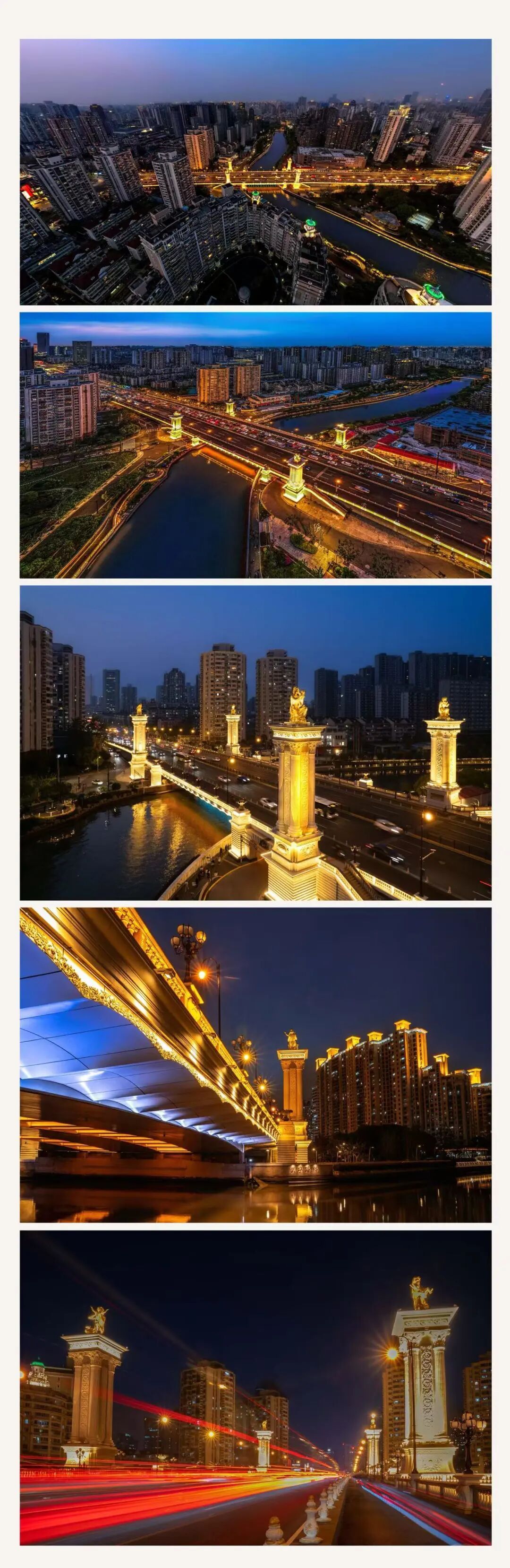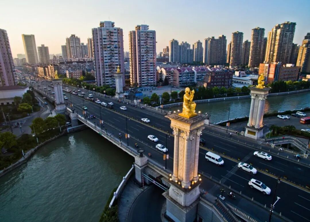 2008年,为迎接世博会,武宁路桥开启艺术转型。设计师从巴黎亚历山大三世桥汲取灵感,并注入中国传统文化元素。4座27米高艾奥尼克式桥头堡拔地而起,顶部贴金铜雕以“孕育、萌芽、成长、希望”四组母子主题,隐喻苏州河作为“城市母亲”的哺育使命;细部宝瓶荷叶纹象征安宁,双雀报喜图祈愿丰年,另有忍冬、石榴、唐草等敦煌壁刻纹饰沿桥身蔓延,诠释了“中西合璧”的设计理念。