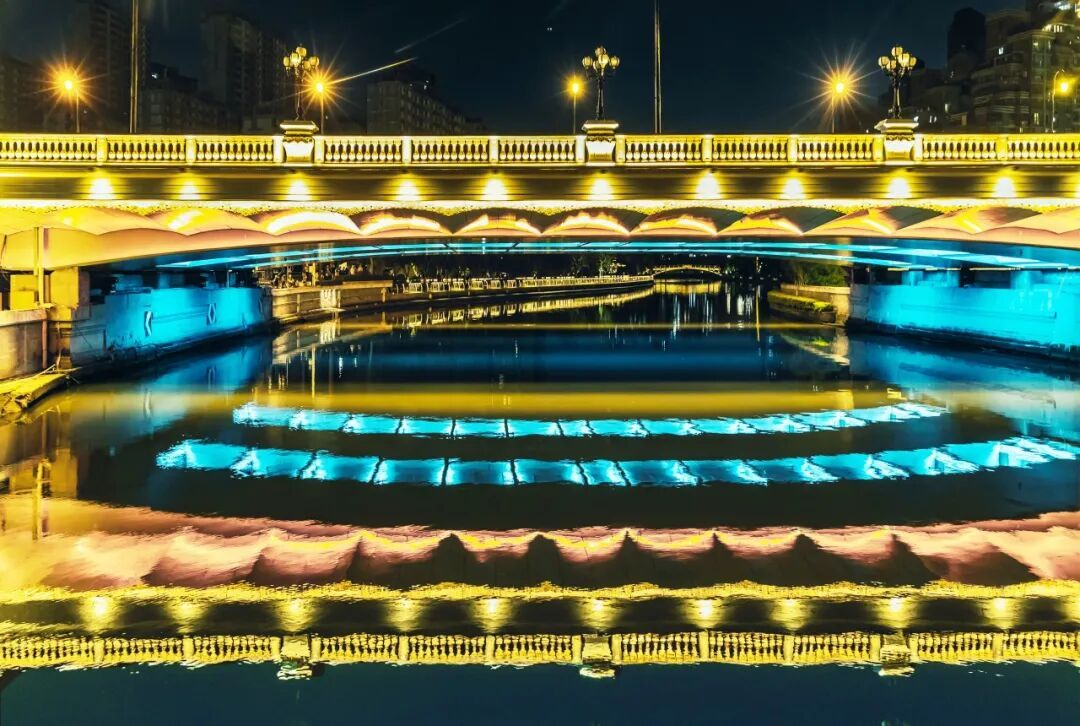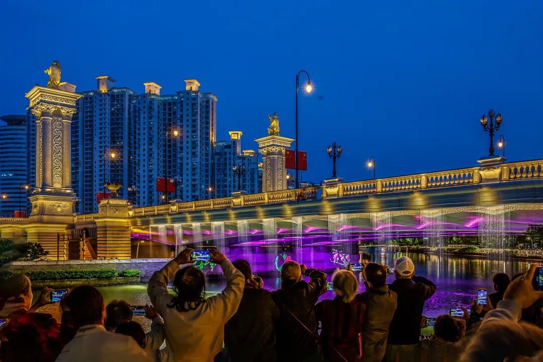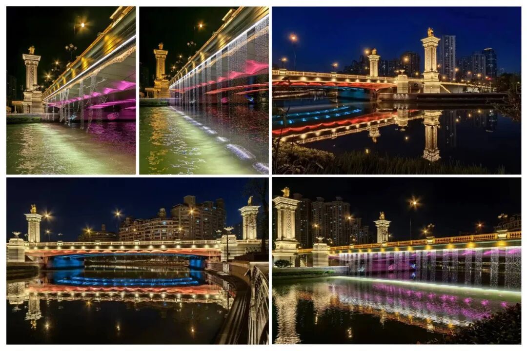 2023到2024年,武宁路桥景观再升级,成为上海市首座跨苏州河灯光水幕景观桥。3200个喷口在桥侧织出40米长的数字水幕,其上“上海欢迎您”、“苏河夜曲”等字样随音乐倾泻;超3000套LED灯具点亮桥体与水域,金色雕塑在可控光色中流转明暗。